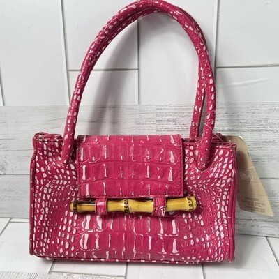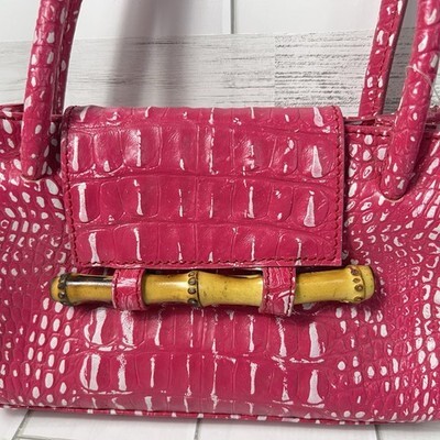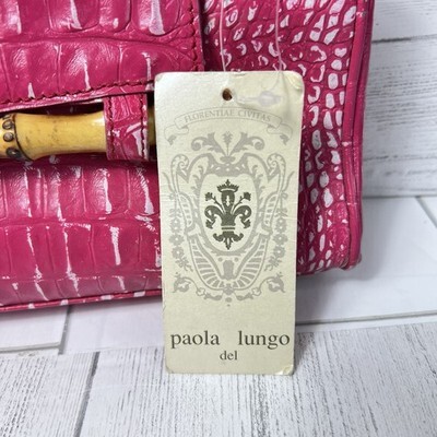 Paola Lungo Firenze Pink Croc Embossed Handbag Bamboo Bar Accent Leather New