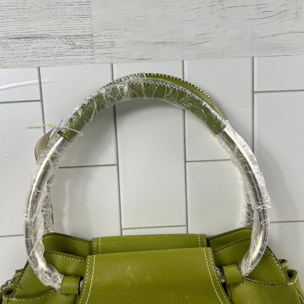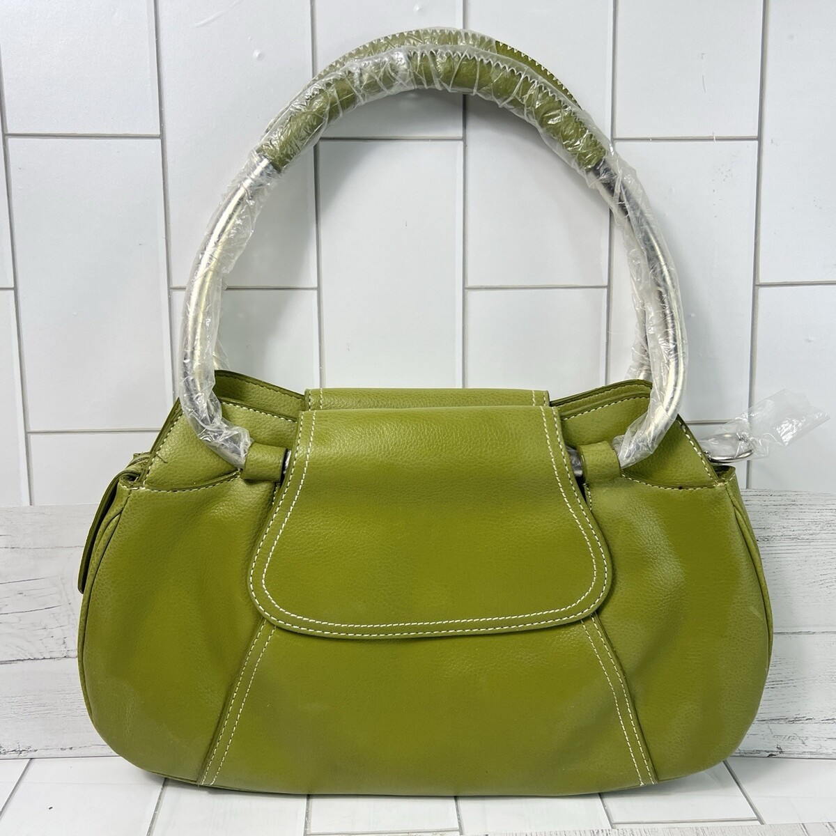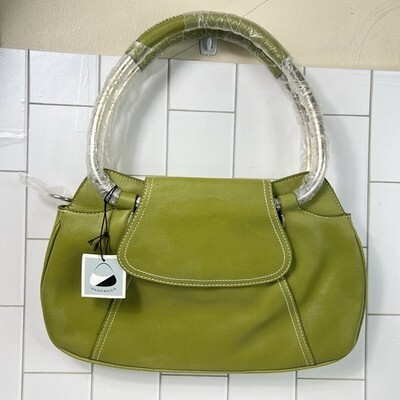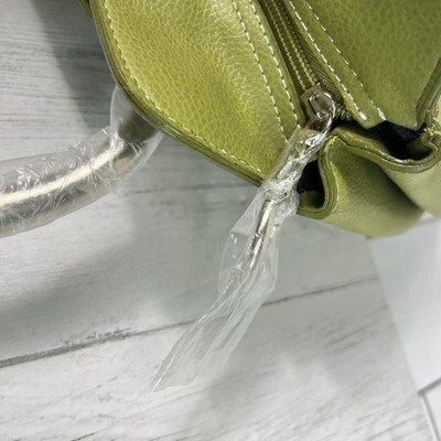 Green Structured Shoulder Bag White Stitching Leather Large Hobo Tote NWT