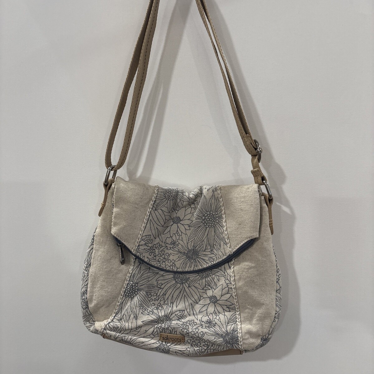 The Sakroots Foldover Crossbody bag in the Blue Floral Print features a stylish design with a zip closure and adjustable crossbody/shoulder strap. Made from durable cotton canvas, this medium-sized bag is perfect for women who want a comfortable yet fashionable accessory. The Lake Flower Power pattern and Sakroots logo accents add a touch of flair to this versatile and trendy handbag.