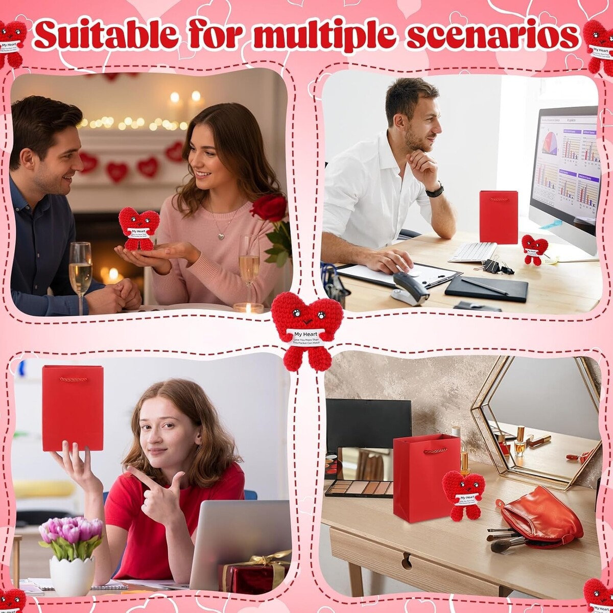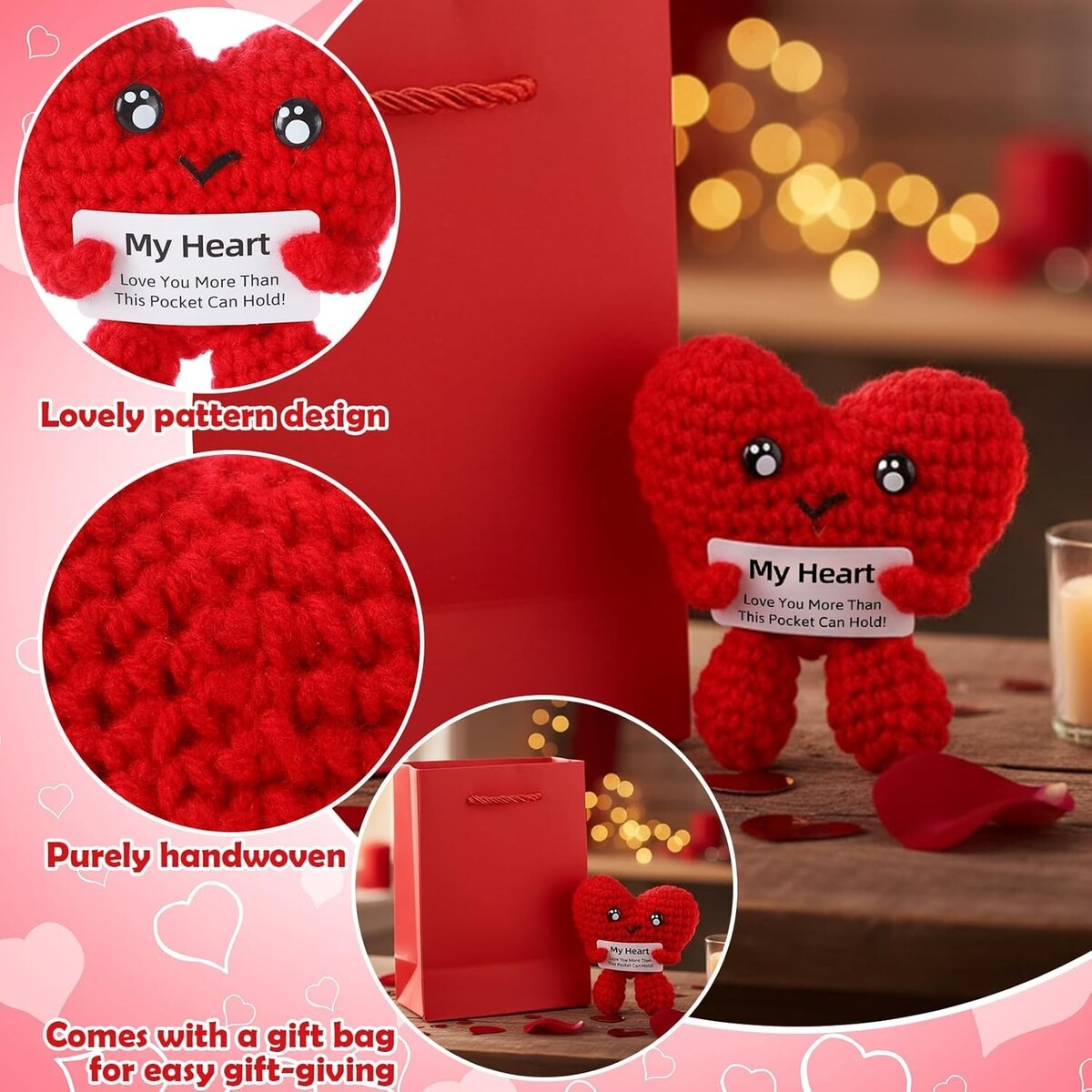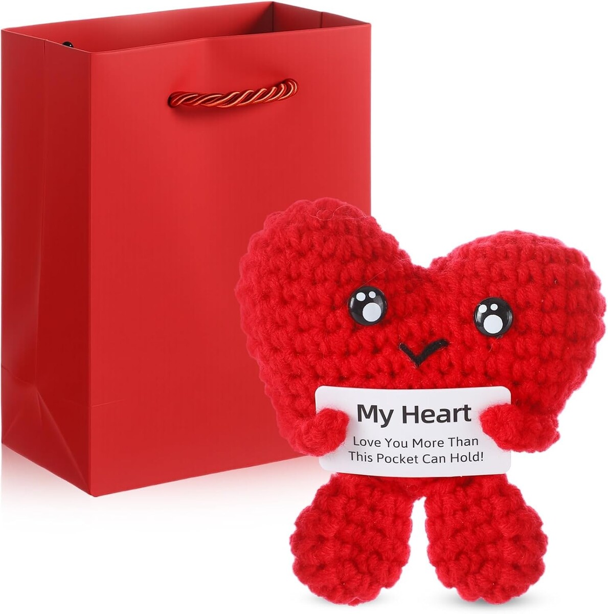 Charming Valentine's Day Gift: Delight your loved one with this red crochet love heart plush, perfectly paired with a sweet Valentine?s Day card and a stylish gift bag. Emblazoned with the delightful phrase ?My Heart,? this unique set is crafted to spark joy and add a touch of whimsy to your romantic celebration.