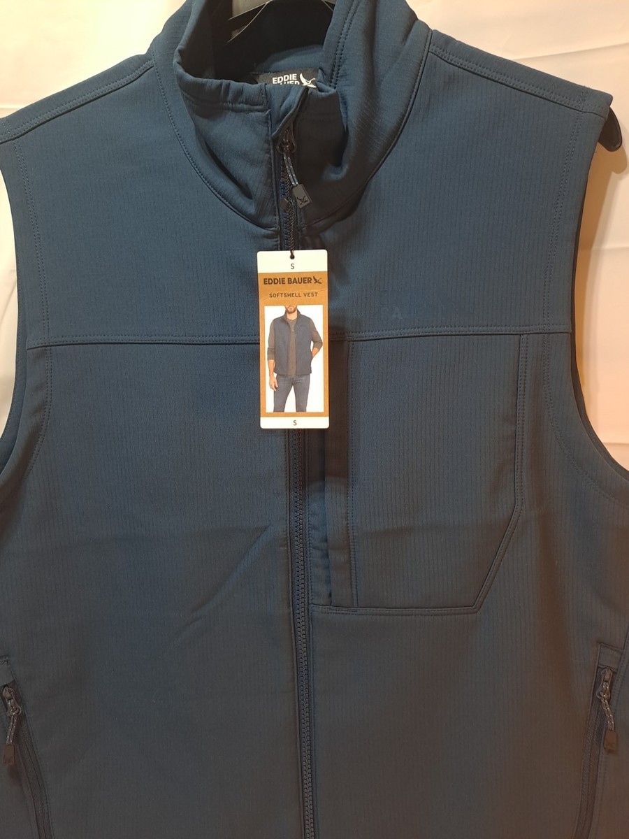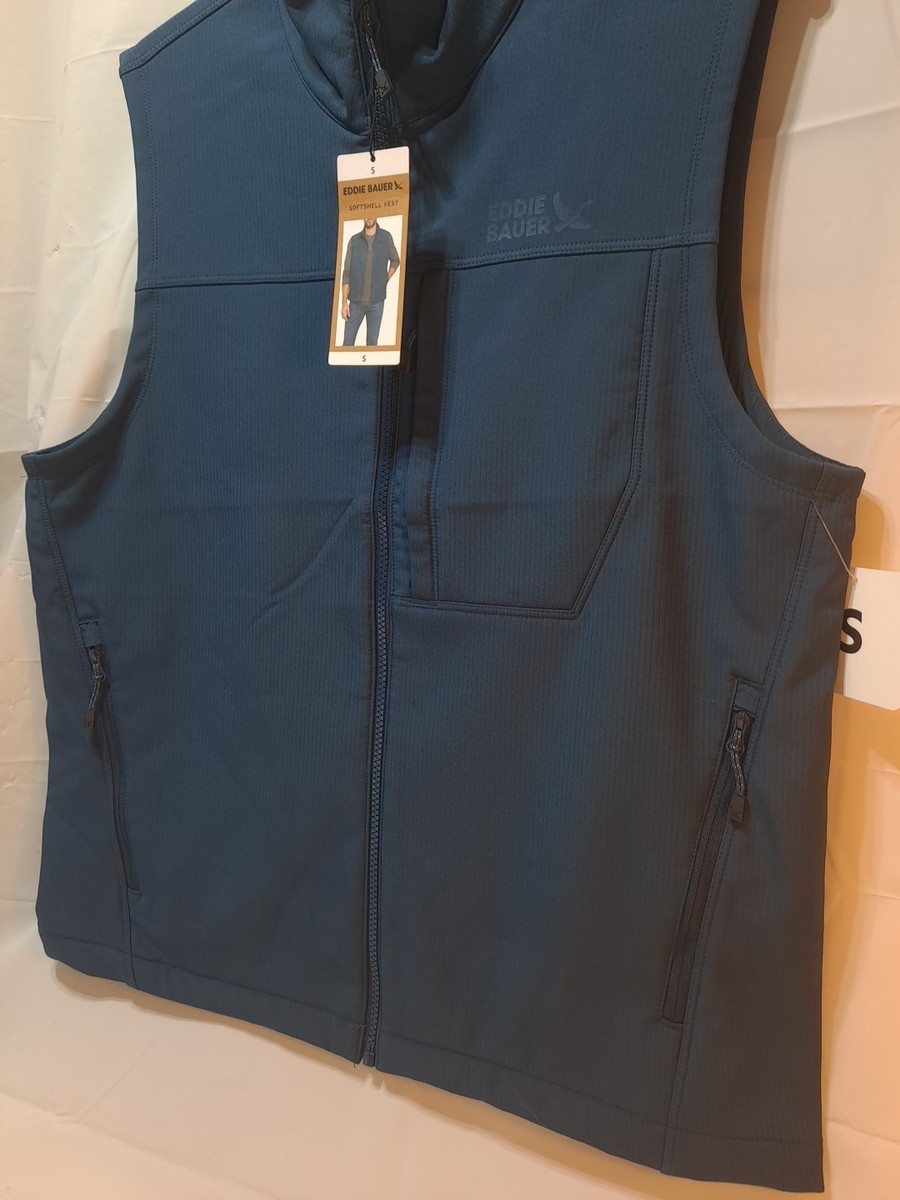 The Eddie Bauer Softshell Vest in size S is a mid-length, blue outerwear piece made of polyester. This lightweight vest features a full zip closure, stand-up collar, and pockets for added convenience. Designed for casual occasions, it offers a regular fit suitable for various activities such as walking, riding, golfing, hiking, and more. The softshell fabric type ensures durability and comfort, making it a versatile addition to any man's wardrobe.