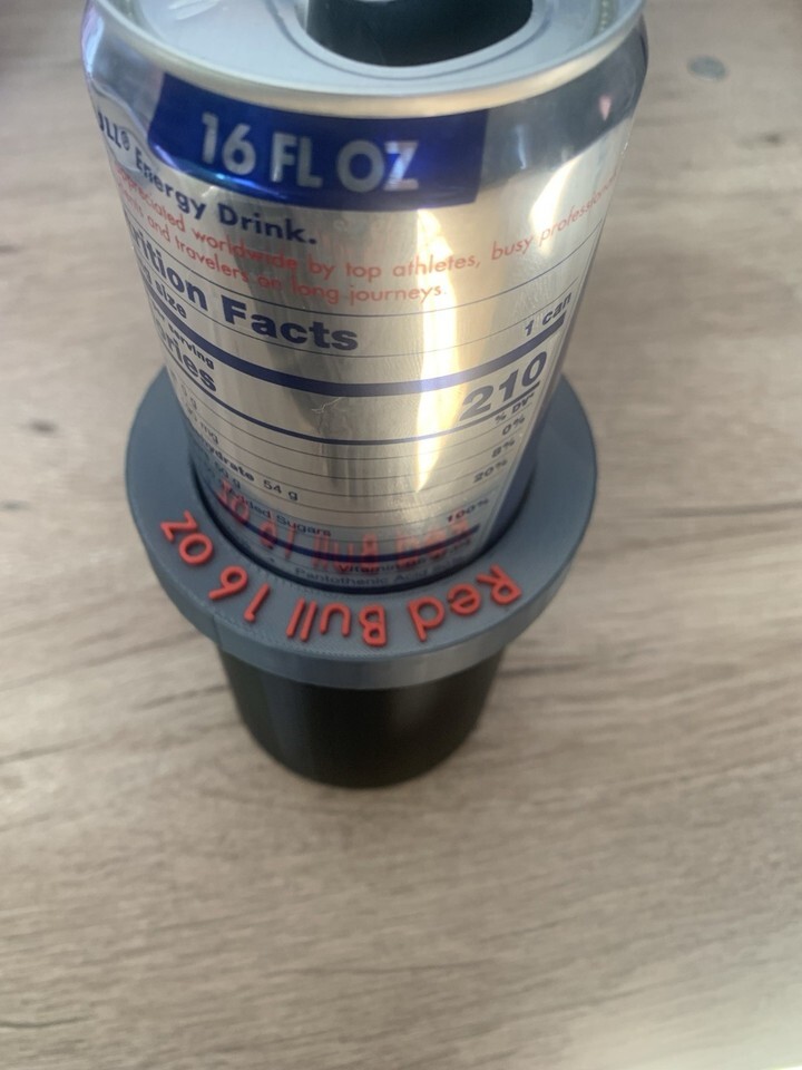 The Red Bull 16 oz can cup holder adapter is a convenient accessory for car and truck owners looking to securely hold their favorite energy drink cans in place while on the road. Made in the United States, this adapter features a vibrant red color that adds a pop of color to your vehicle's interior. Designed specifically for a 16 oz can size, this cup holder adapter is a must-have for Red Bull enthusiasts on the go. Can possibly make other versions just let me know.