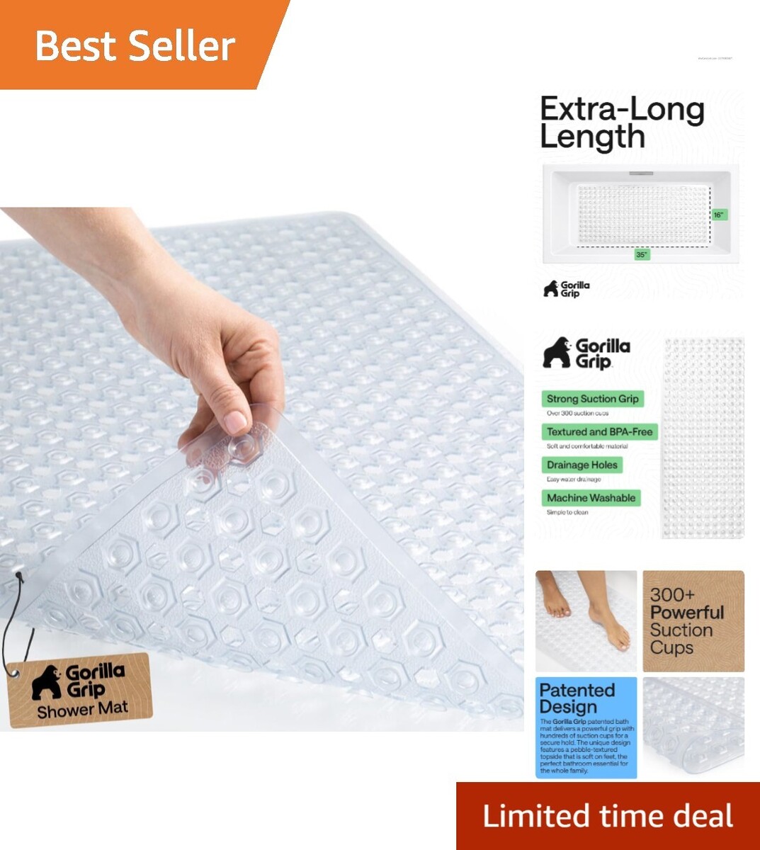 Soft & Secure 35x16 Bath Mat - Patented Shower Liner with Powerful Suction Cups