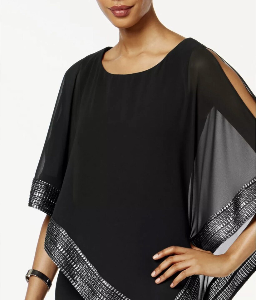 Short-Sleeve Asymmetrical Popover Dress With Foil Trim. Pop Over Cape Dress.
