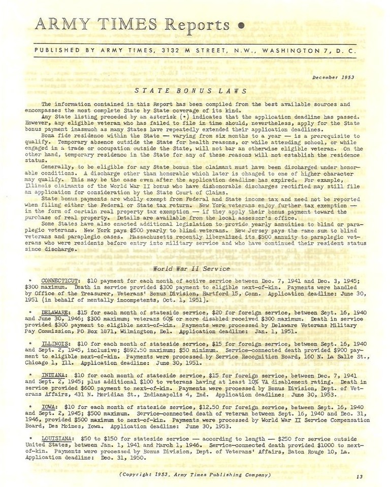 ARMY TIMES REPORTS December 1953 4-page newsletter
