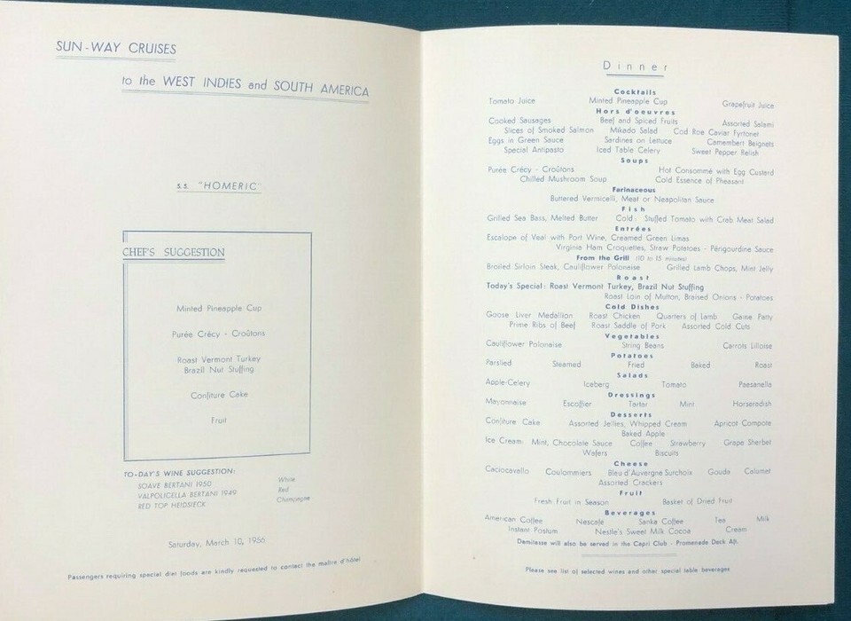 HOME LINES vintage S.S. Homeric West Indies cruise Dinner Menu March 10, 1956