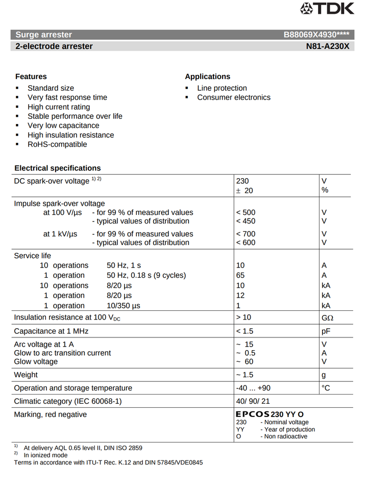 10 Pieces - B88069X4930S102 EPCOS Axial 230V 20% 12kA Surge Arrester 2-Electrode GDT