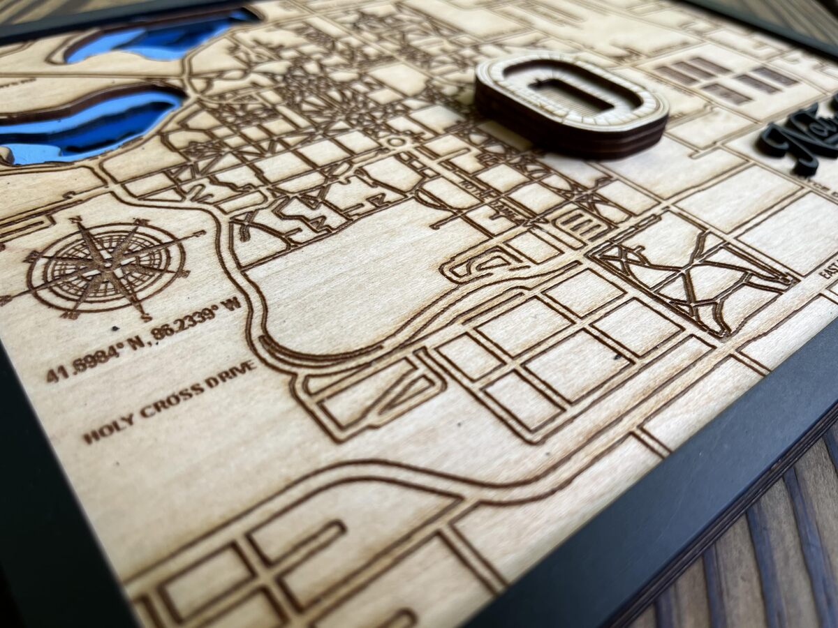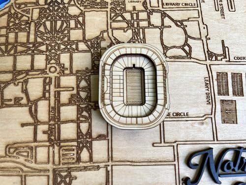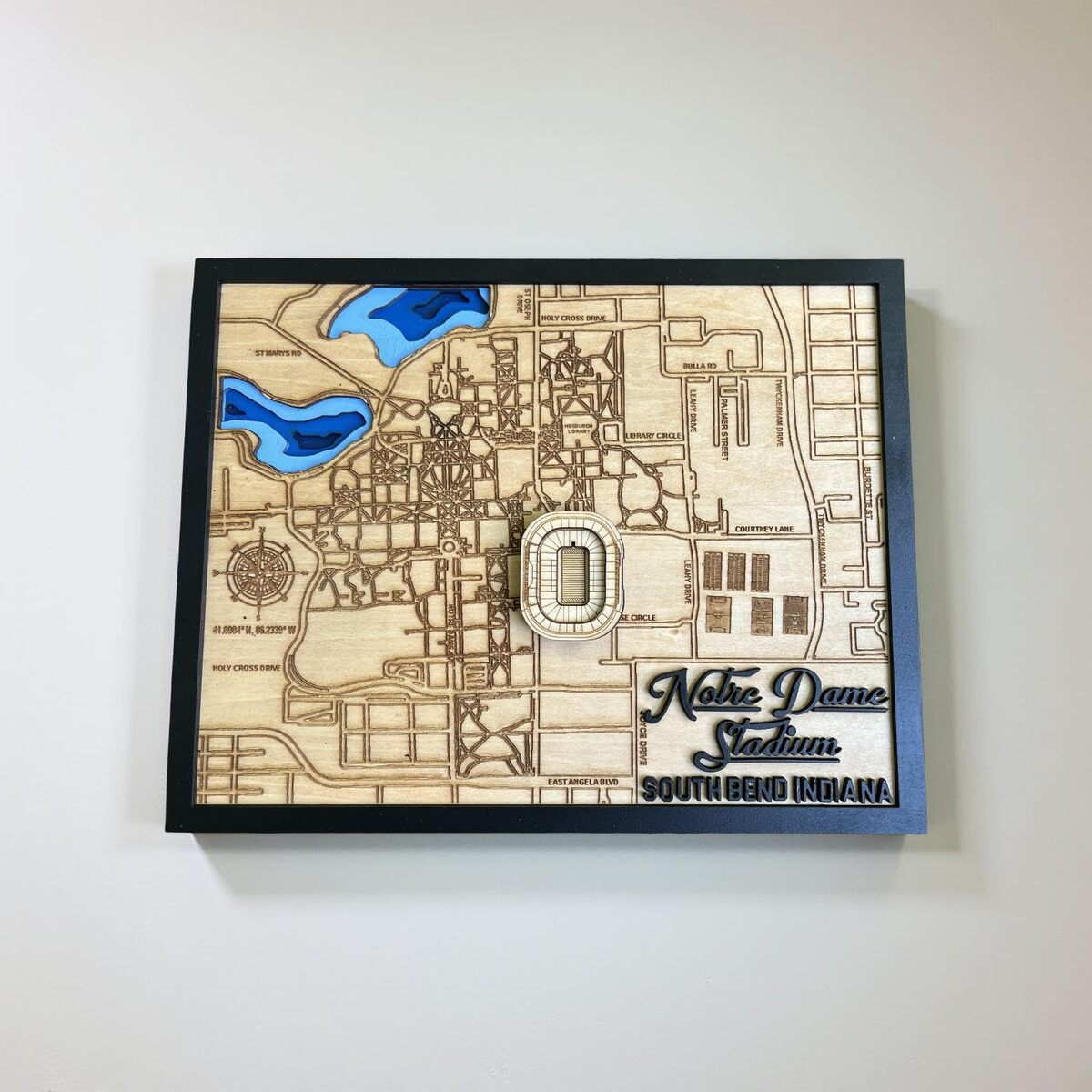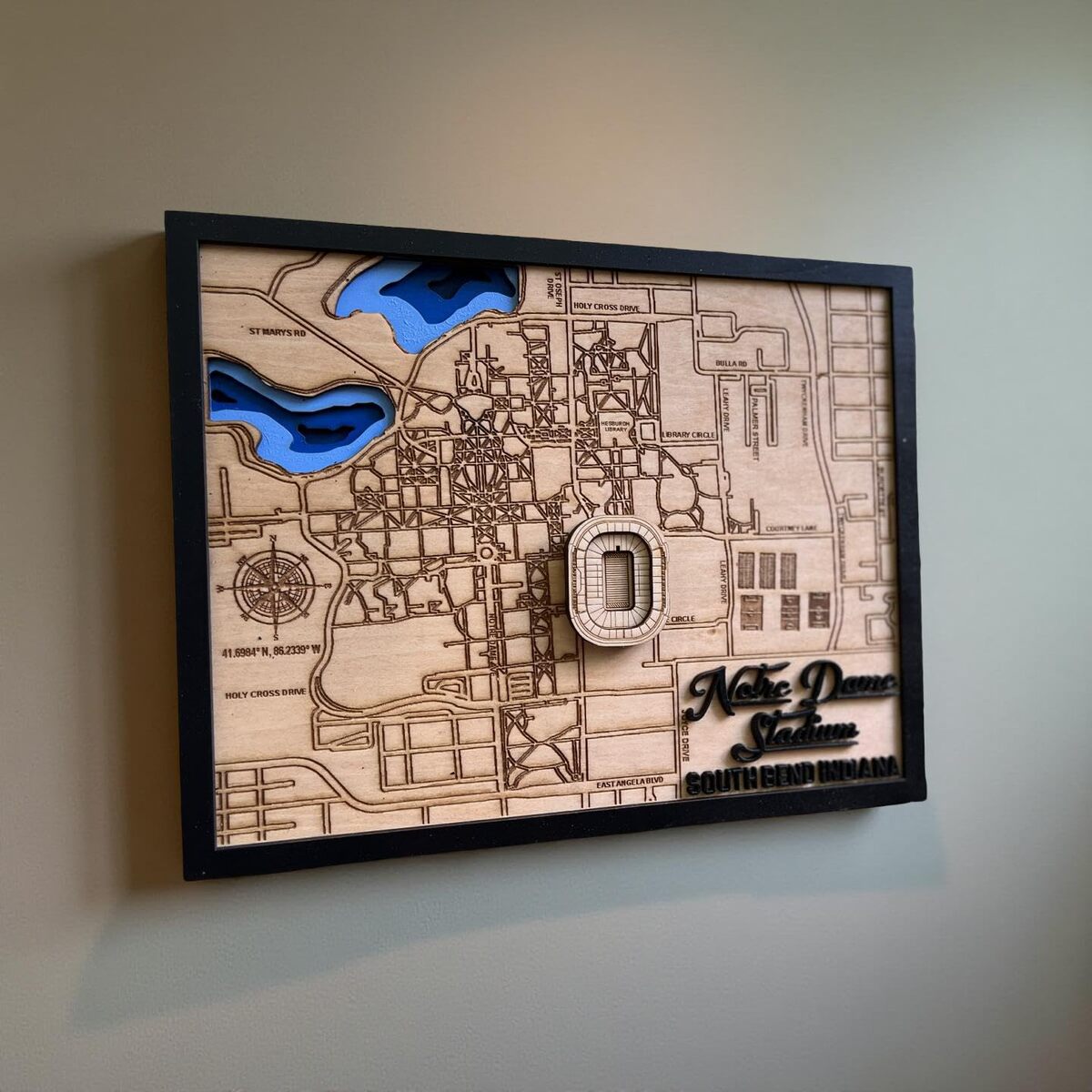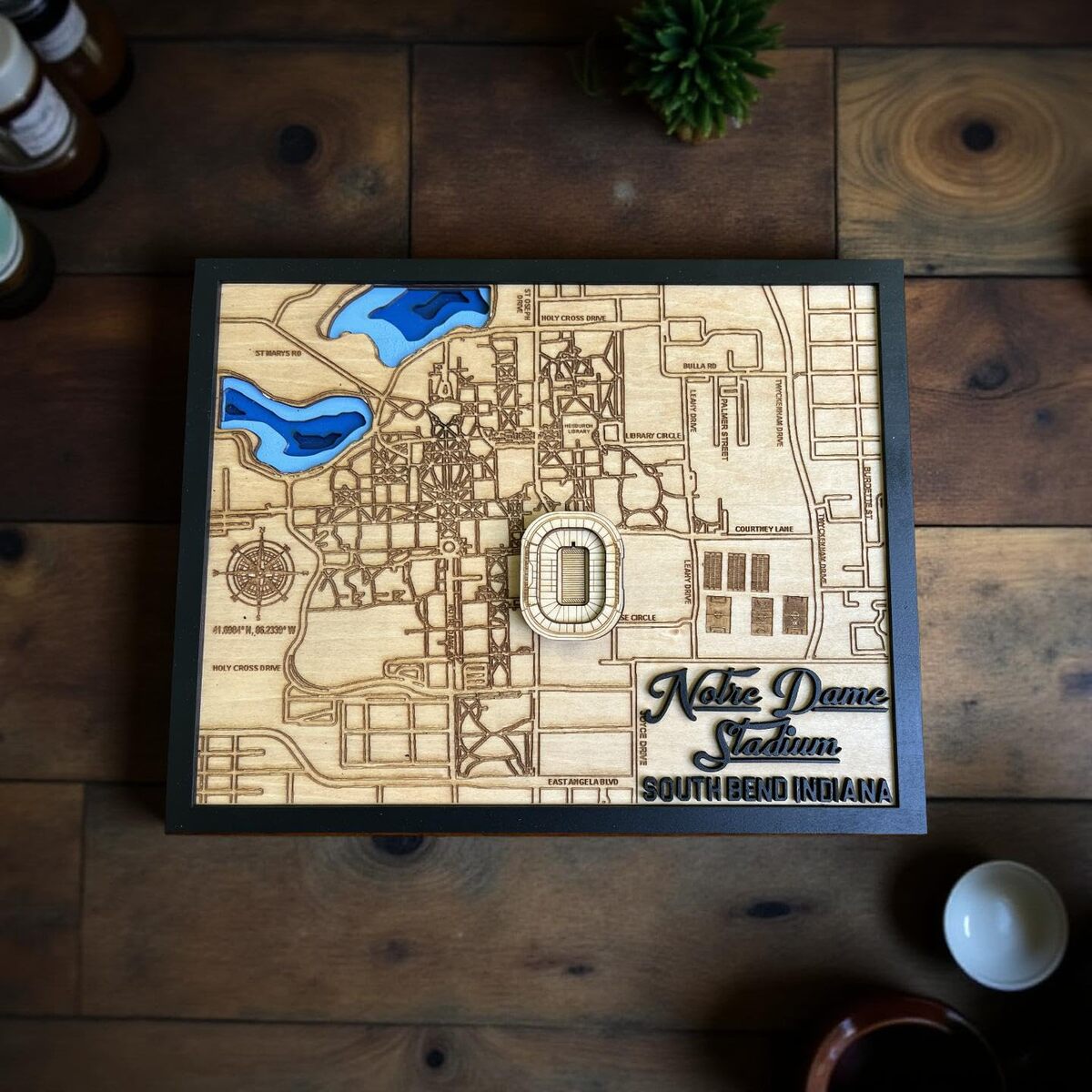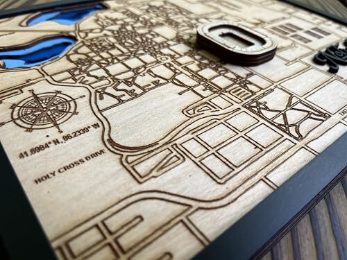 Product description: Bring the iconic Notre Dame Stadium to life with this meticulously crafted wooden wall art featuring a detailed 3D stadium map of South Bend, Indiana. This unique piece showcases the legendary football venue with stunning architectural precision, complete with intricate laser-etched details of the surrounding campus streets and landmarks. The stadium's distinctive oval shape rises from the wooden surface, creating an eye-catching dimensional effect. Set against a natural wood background with striking blue accents representing nearby lakes, this framed map art includes precise geographical markers and a decorative compass rose. The black frame provides a sophisticated finish that will complement any room. Perfect for fans, alumni, or anyone who appreciates distinctive sports-themed decor. This conversation-starting piece combines cartographic artistry with collegiate pride, making it an ideal gift for football enthusiasts or a standout addition to your home or office wall.