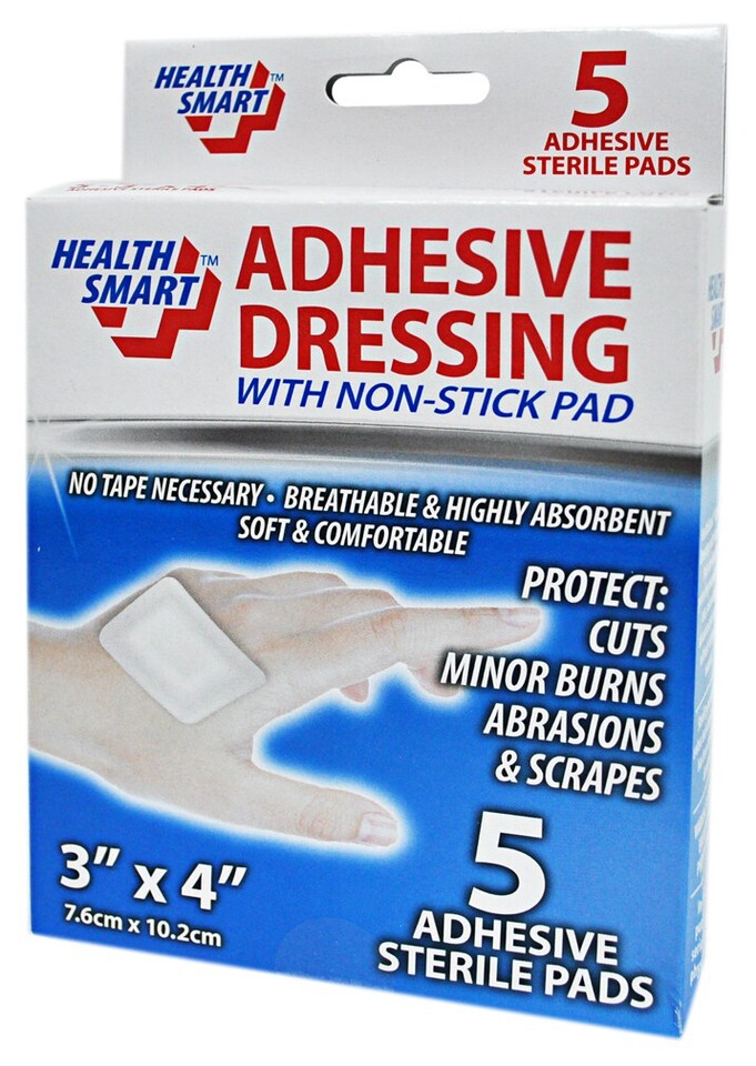 Five 3 inch x 4 inch adhesive sterile pads in package.