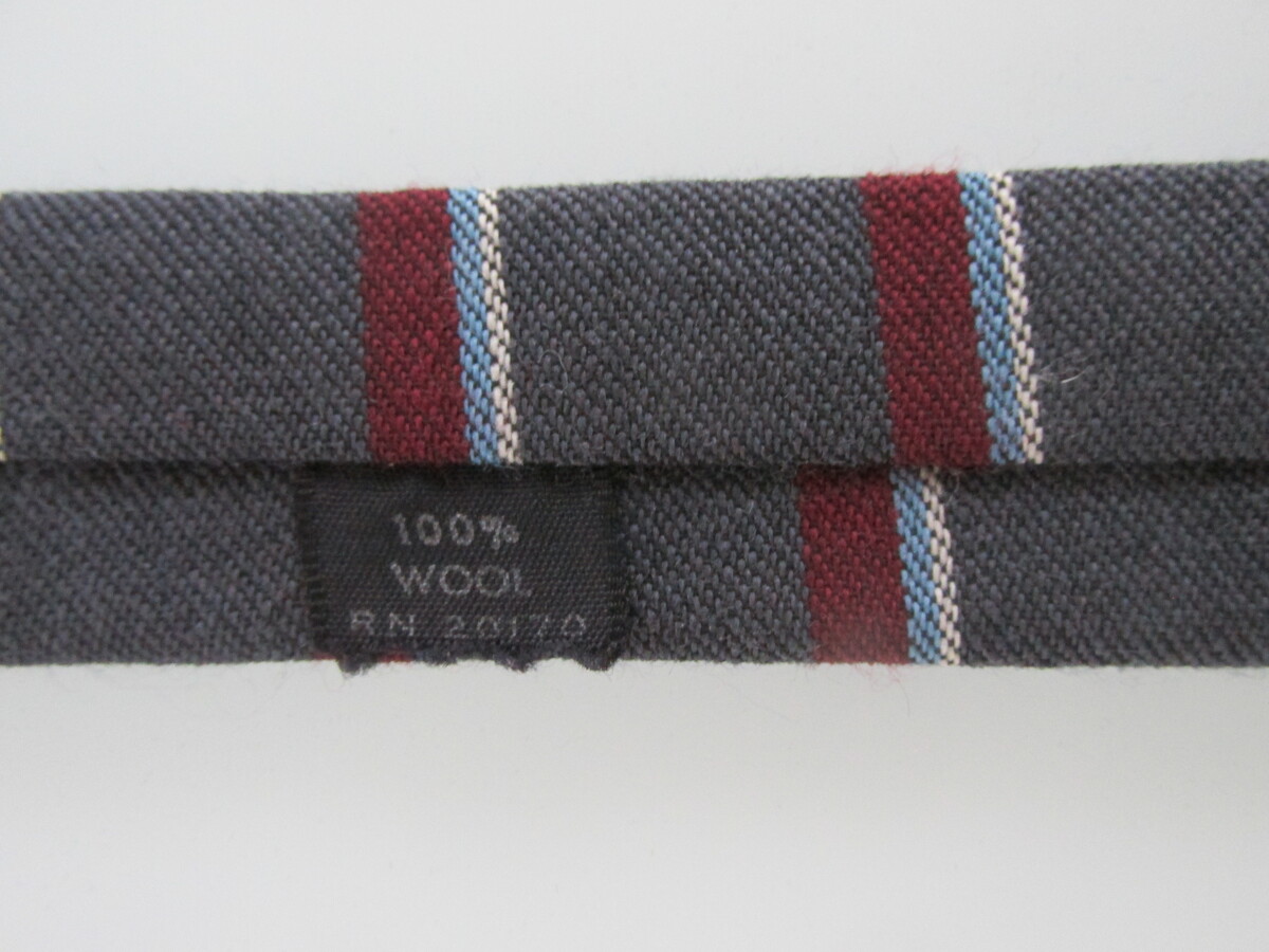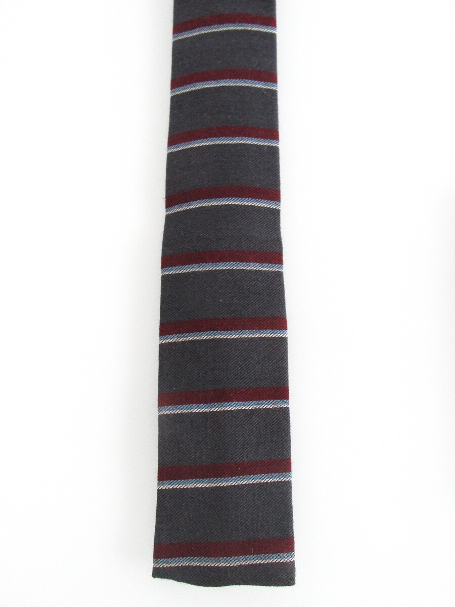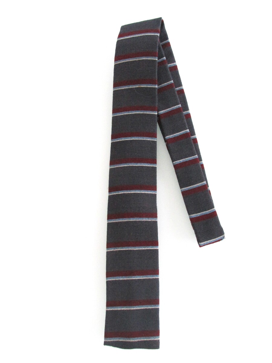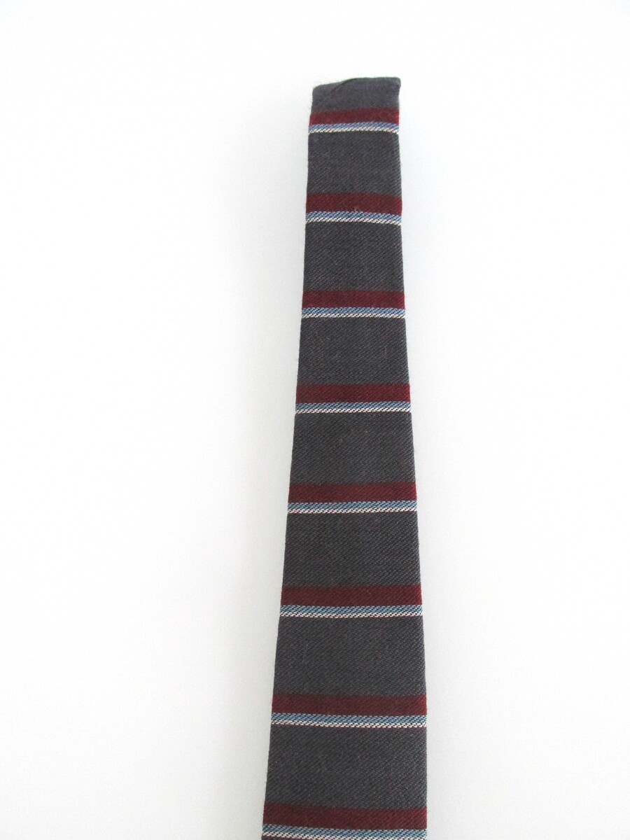 Description: Up for sale is a flat square bottom vintage men's wool tie. This tie is made of 100% wool. It has a multicolored horizontal striped pattern in red, light blue white on a charcoal gray background. Dimensions are 56" long x 2.50" wide. This tie is in perfect condition.