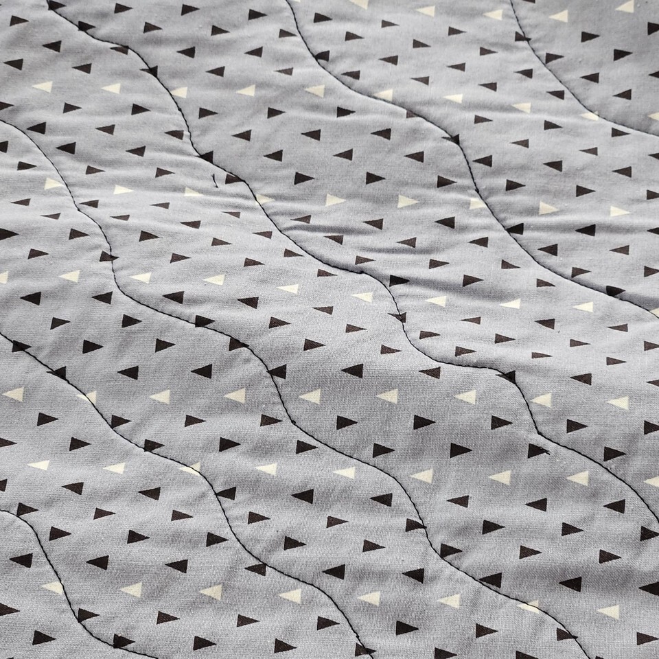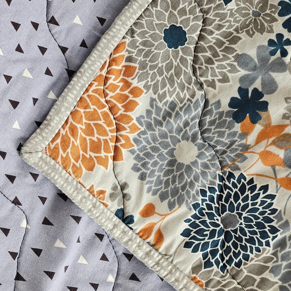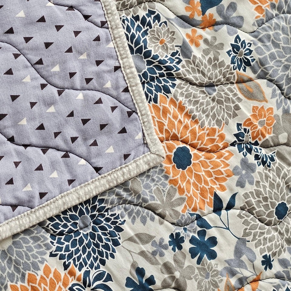 This cuddly handmade whole cloth quilt is perfect for tummy time, a stroller cover, or an on the go blanket. Measuring 48.5"x39.75", one side features a soft blue, gray and rust floral theme and the other side has blue and white triangles. Both layers are made from 100% quilting cotton fabric. A layer of mid-weight cotton batting sandwiched in between the layers adds extra warmth and softness. The machine quilting was done with organic wavy lines for a loosely structured finish. Ideal for keeping your little one cozy and comfortable, this quilt is a unique addition to any nursery.