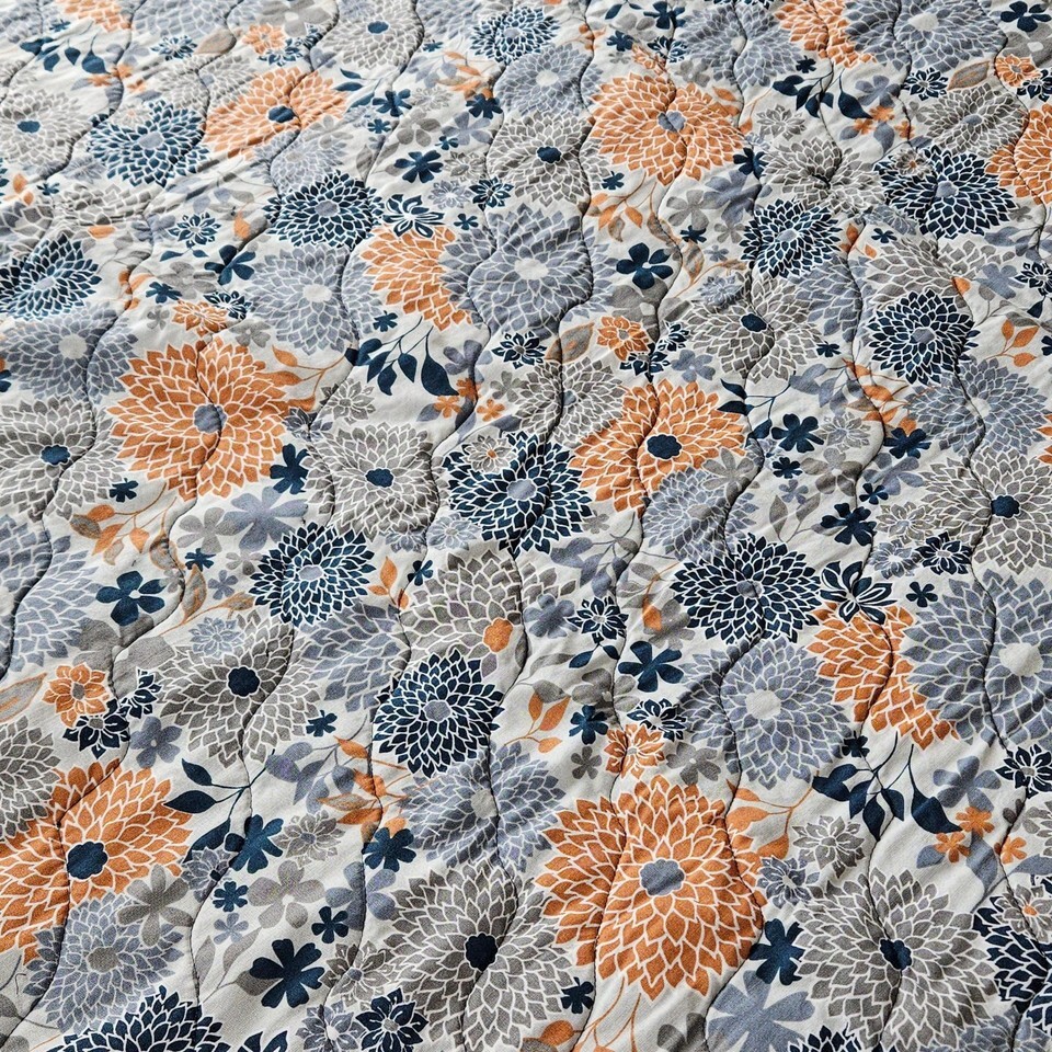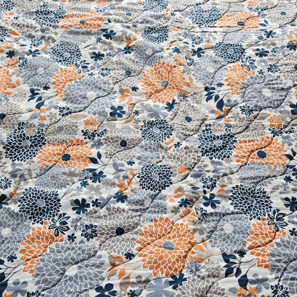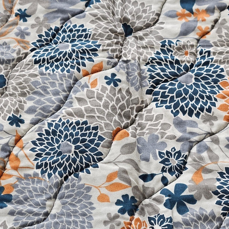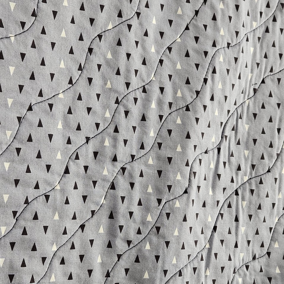 This cuddly handmade whole cloth quilt is perfect for tummy time, a stroller cover, or an on the go blanket. Measuring 48.5"x39.75", one side features a soft blue, gray and rust floral theme and the other side has blue and white triangles. Both layers are made from 100% quilting cotton fabric. A layer of mid-weight cotton batting sandwiched in between the layers adds extra warmth and softness. The machine quilting was done with organic wavy lines for a loosely structured finish. Ideal for keeping your little one cozy and comfortable, this quilt is a unique addition to any nursery.
