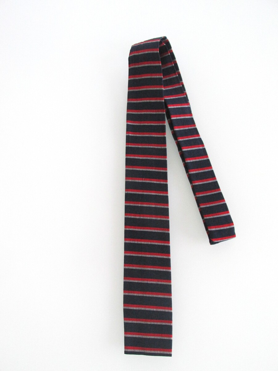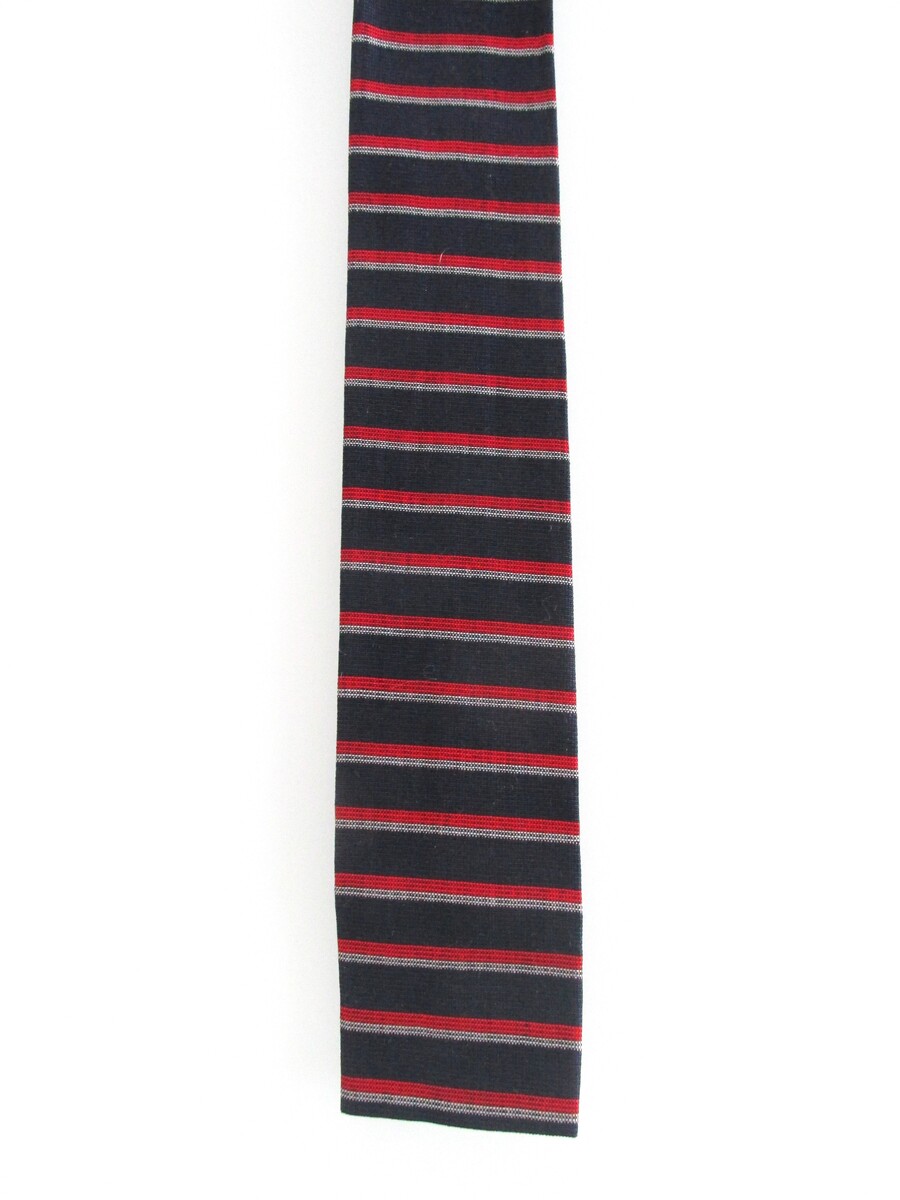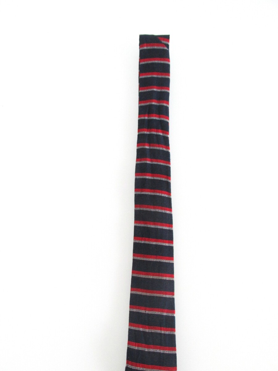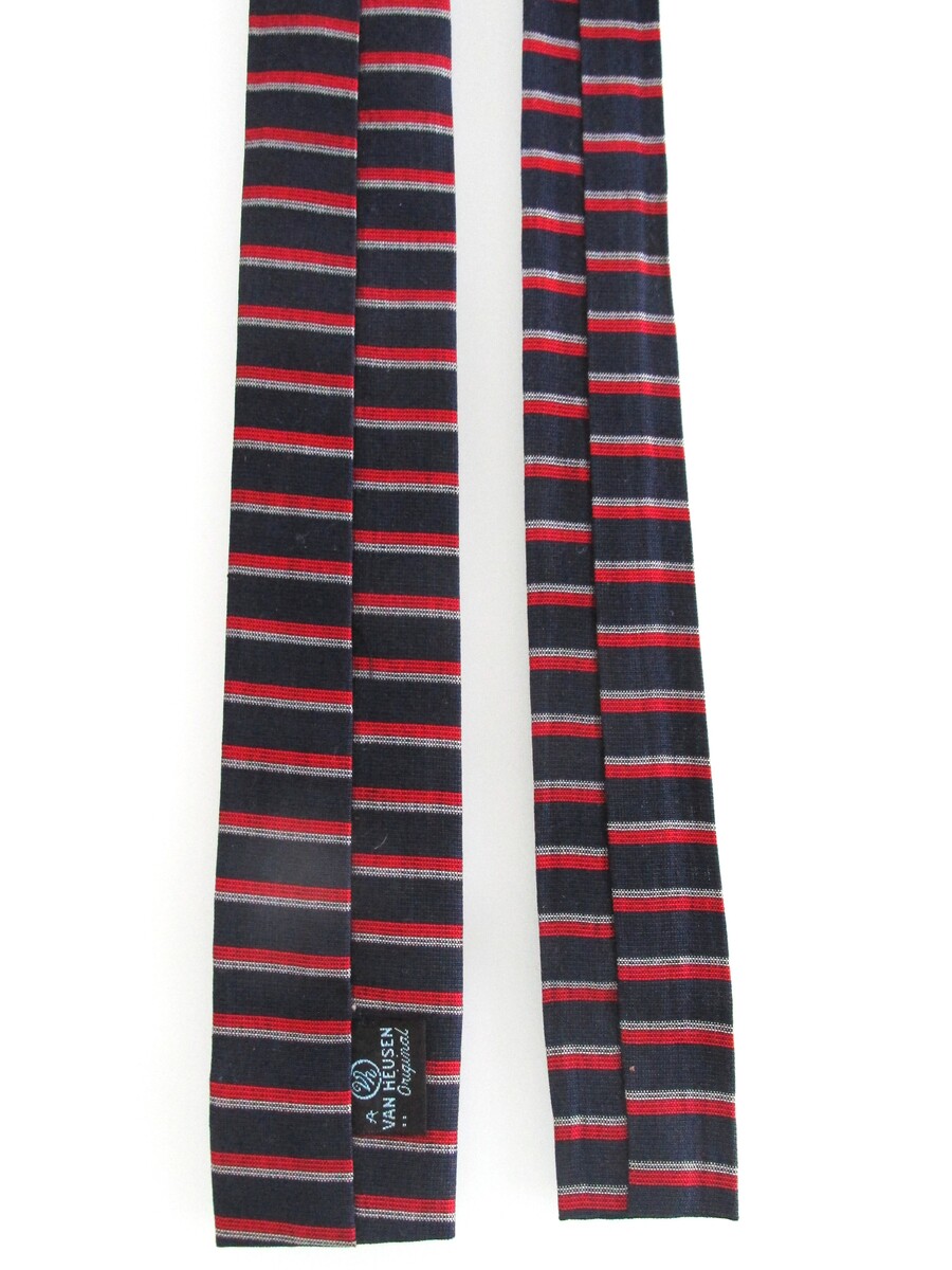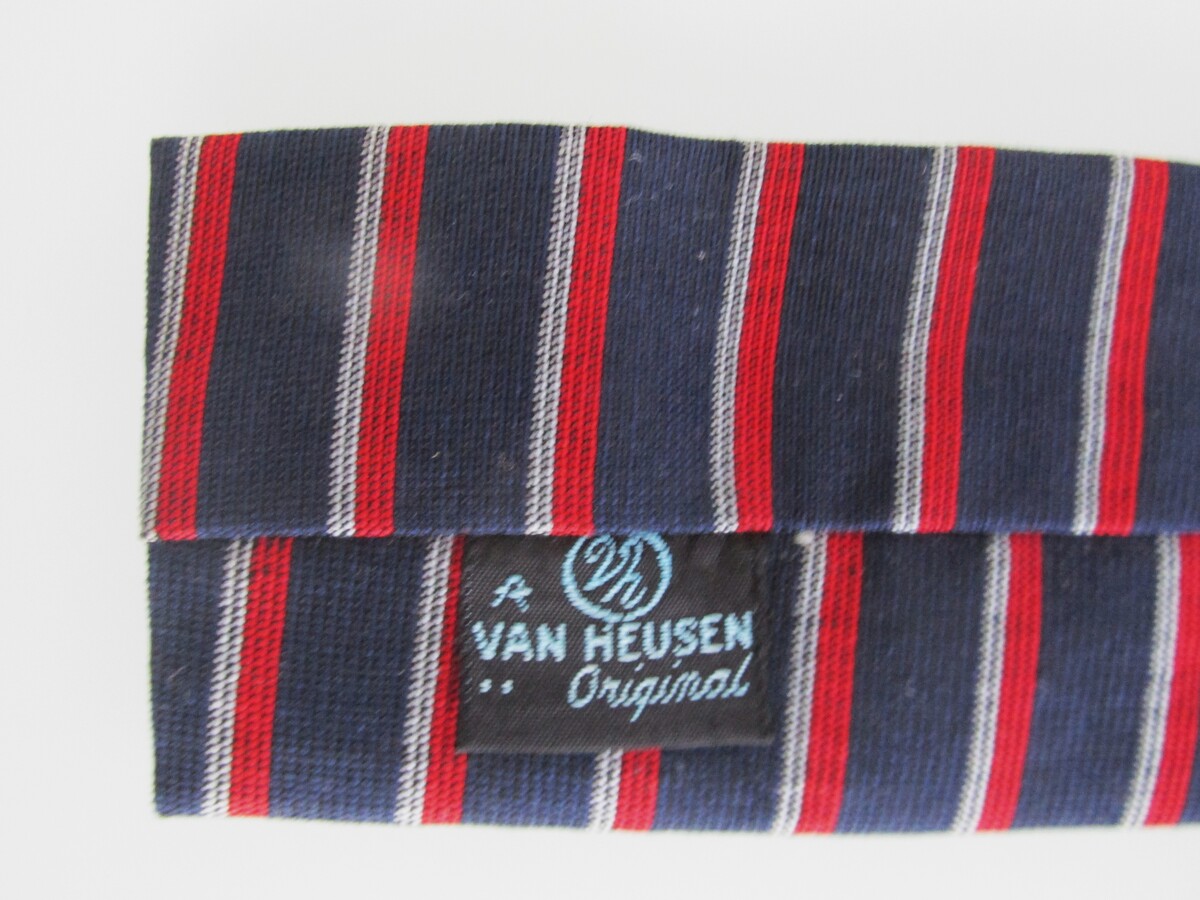 Description: Up for sale is a Van Heusen flat/square bottom vintage men's tie. This tie is a cotton/silk blended fabric. It has a horizontal striped pattern in red white on a navy blue background. Dimensions are 51" long x 2.00" wide. This tie is in perfect condition.