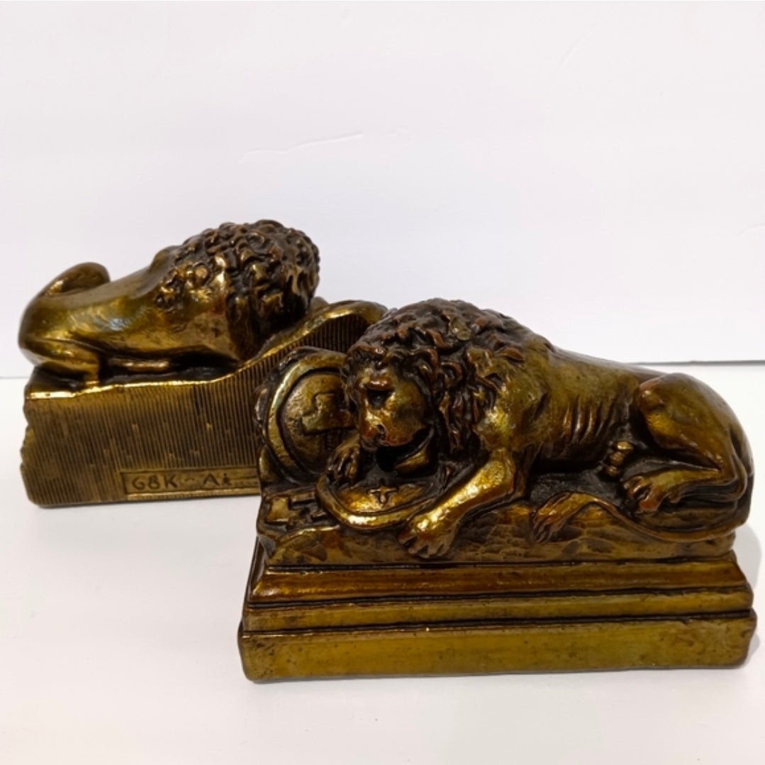 A striking pair of vintage Lion of Lucerne bookends inspired by the famous Swiss monument in Lucerne. Each lion is sculpted in a reclining pose with rich detail and finished in a warm antique gold enamel that highlights the texture of the mane and body.