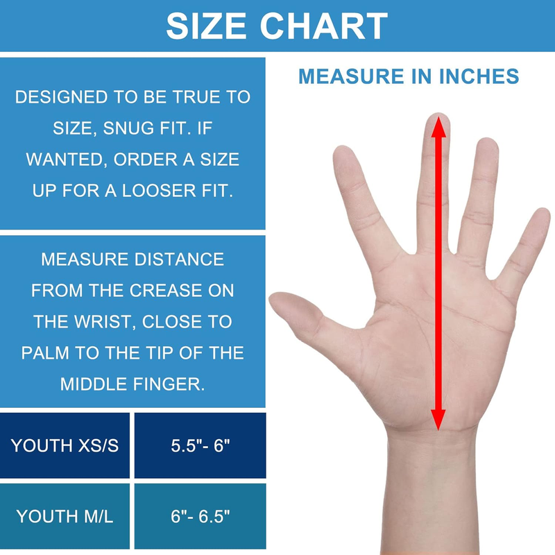 Perfect fit Size ? Size chart Youth XS/S(5.5in-6in) Youth M/L(6in-6.5in). The contoured neoprene wrap-around wrist closure ensures a tight customizable fit to your hands for maximum comfort and performance.