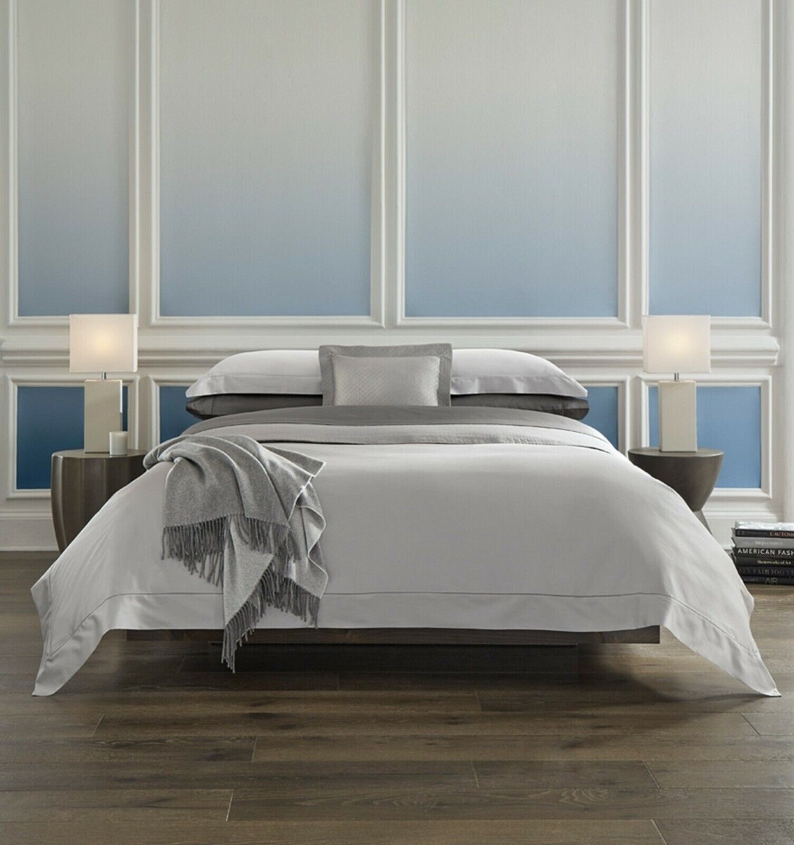 Sferra's classic sateen with a luminous sheen, rich drape and silken hand, Giotto is a 590TC Extra Long Staple cotton product made in Italy. The sheets, cases and shams are finished with a crisp, classic border of hemstitching. The duvet cover is flanges with hemstitch on three sides. The bed skirt is gathered with a plain hem. One of the top five sheet sellers at Sferra.