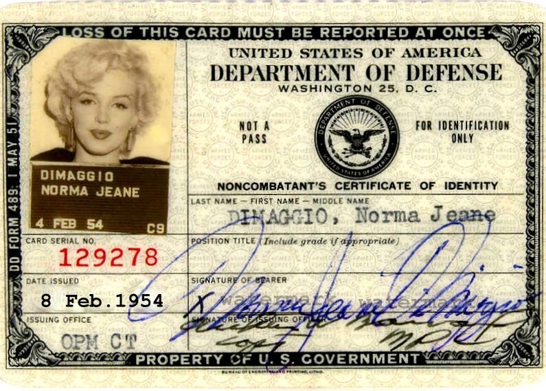Marilyn Monroe Government ID Badge PHOTO Card Signed Repro DOD USO Tour 1954