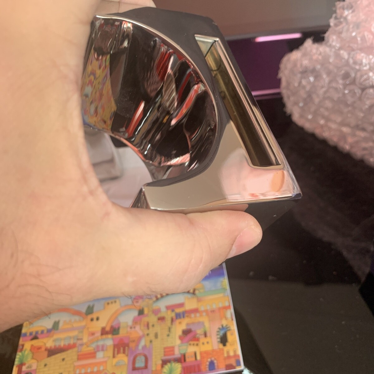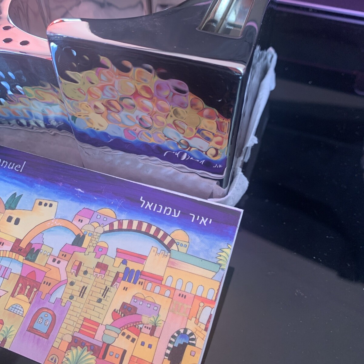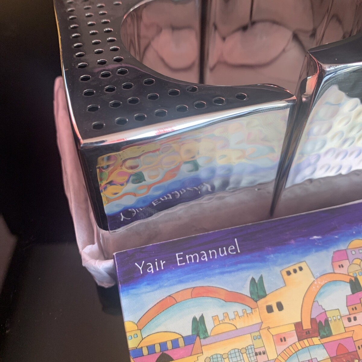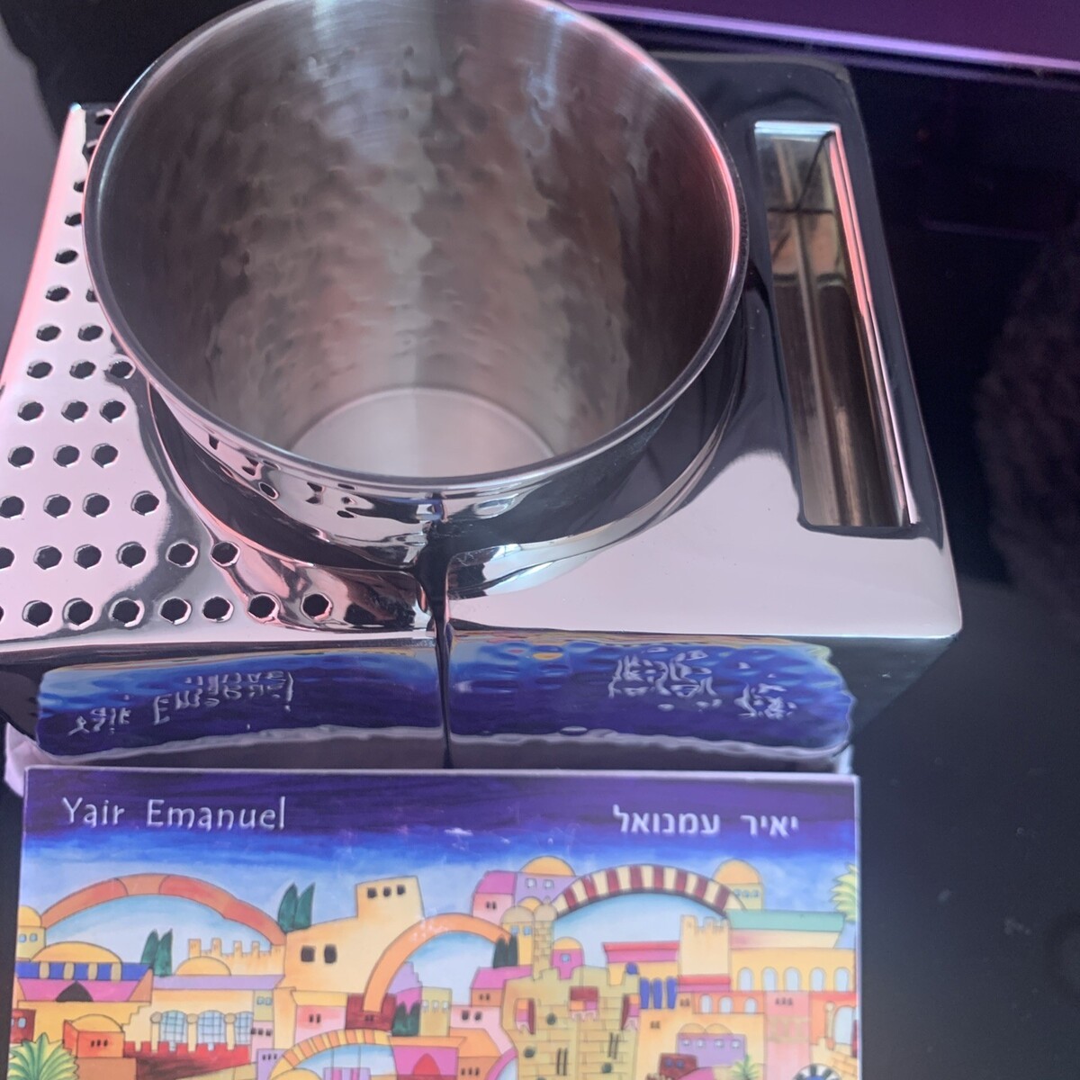 This Havdallah set, made in Israel, is a beautifully crafted piece featuring hammer work and adorned with silver accents. Handmade with precision, this set is infused with Jewish religious symbolism and tradition. Perfect for collectors of religious artifacts or those seeking a special piece to enhance their spiritual practice, this set is a unique and meaningful item that originates from the heart of Israel.
