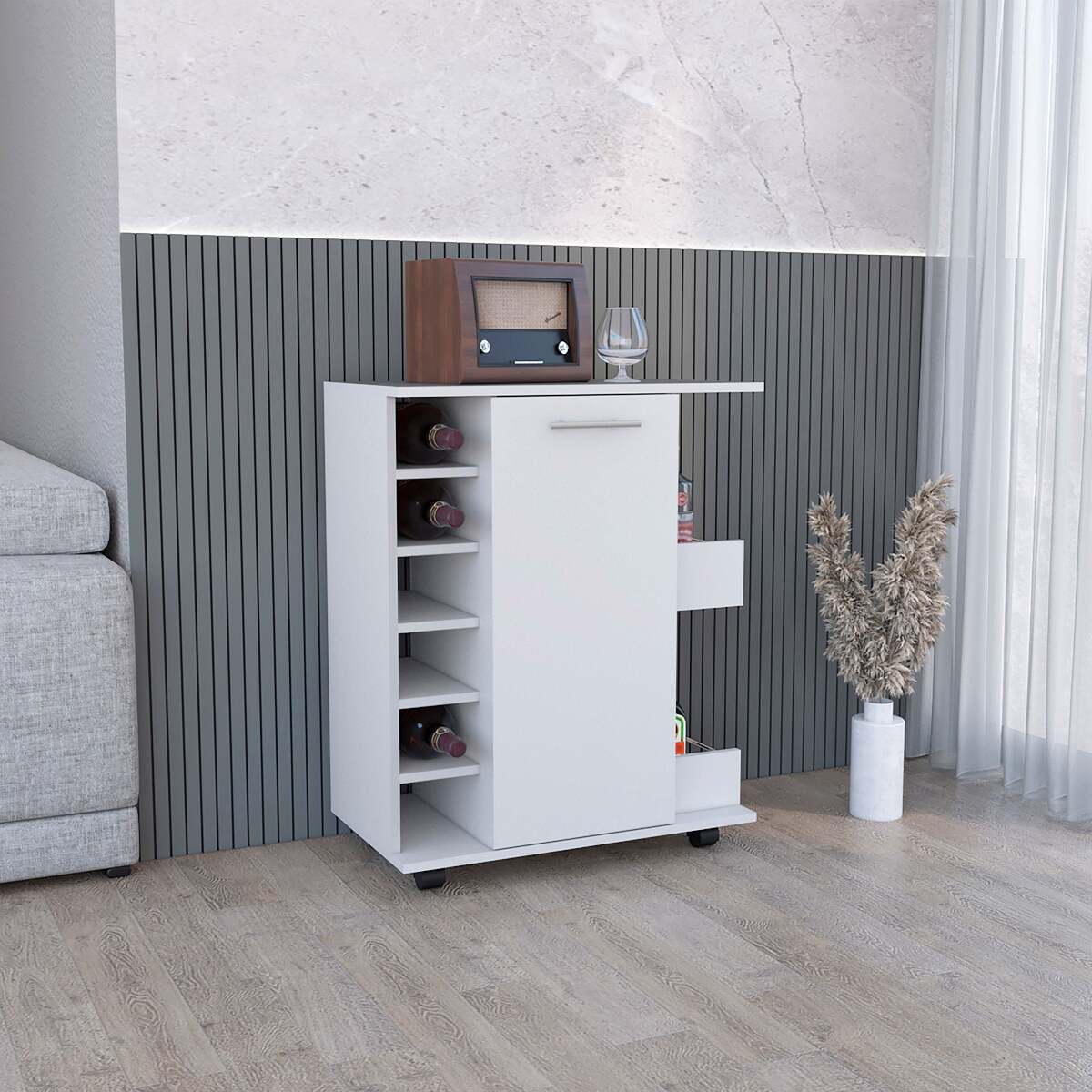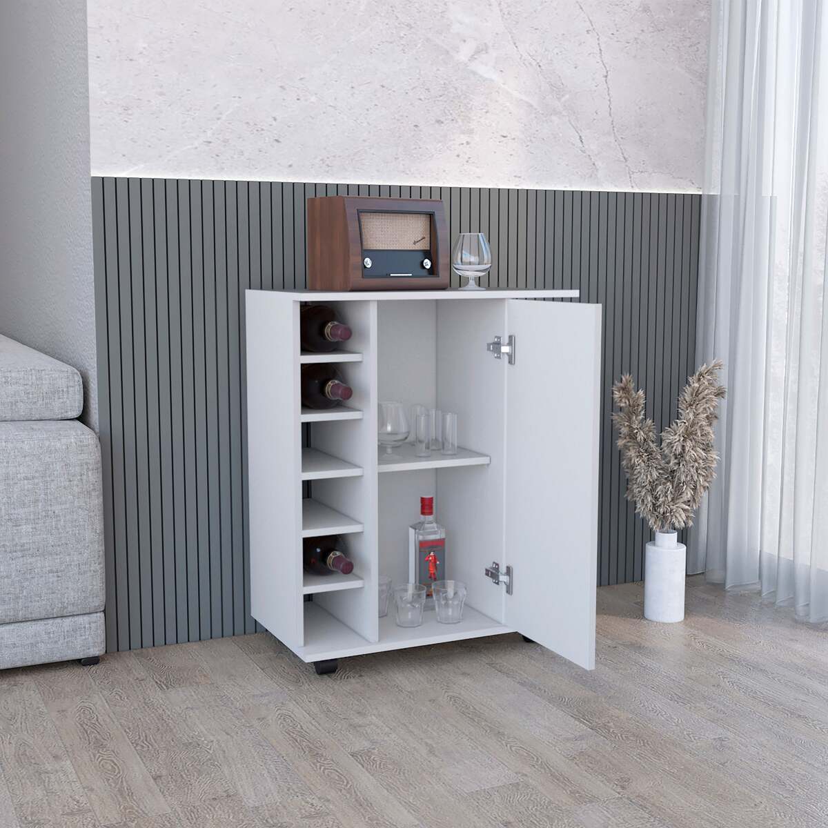 The single-door cabinet offers hidden storage for bar tools, glassware, and other essentials, helping you keep your space organized and clutter-free.