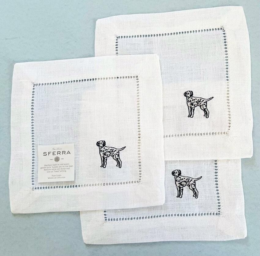 Sferra Embroidered Dalmatian Dog Cocktail Napkins 3 Piece 100% Linen 6x6" New