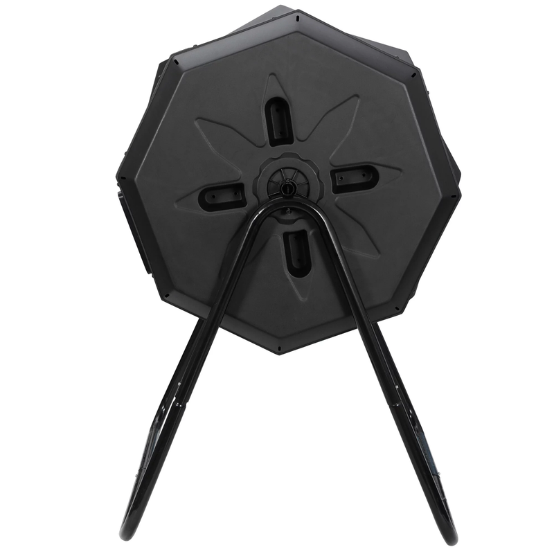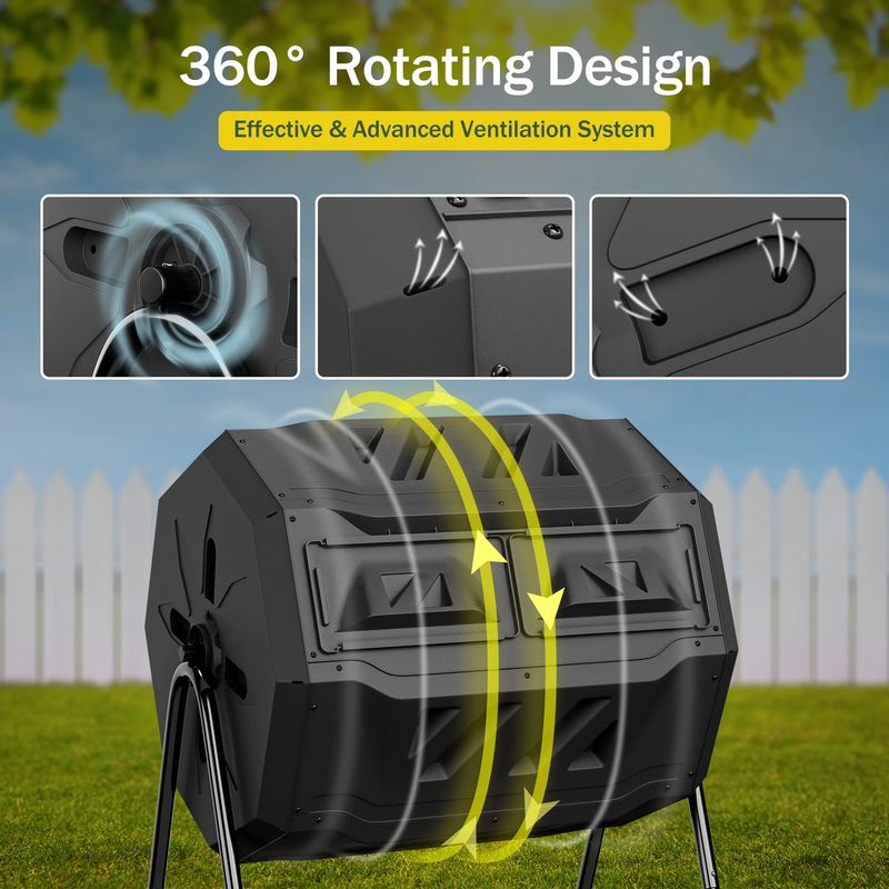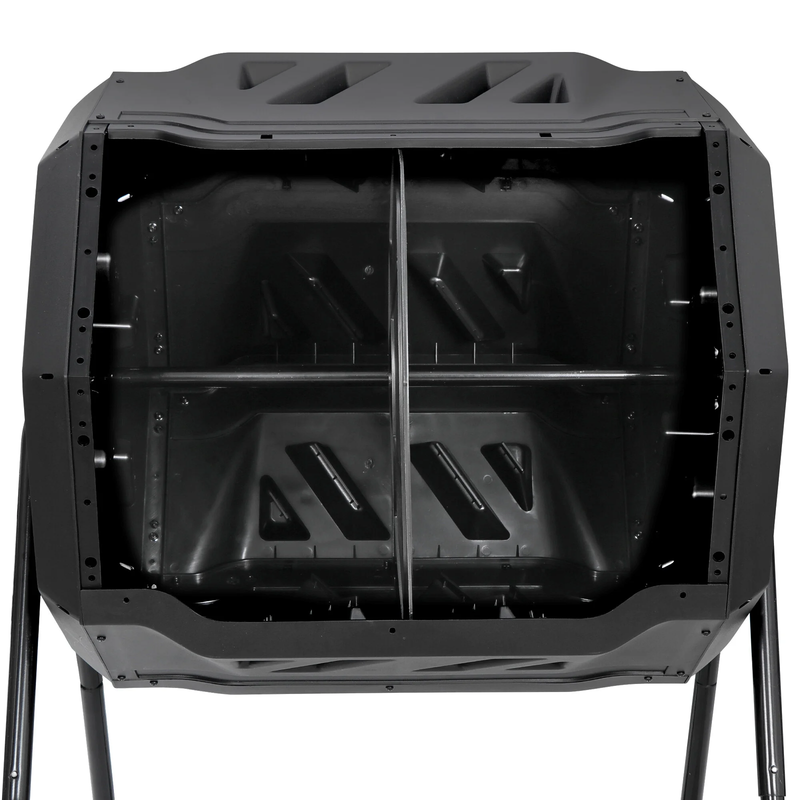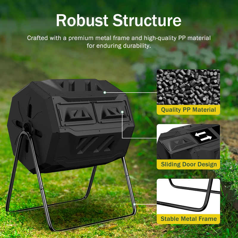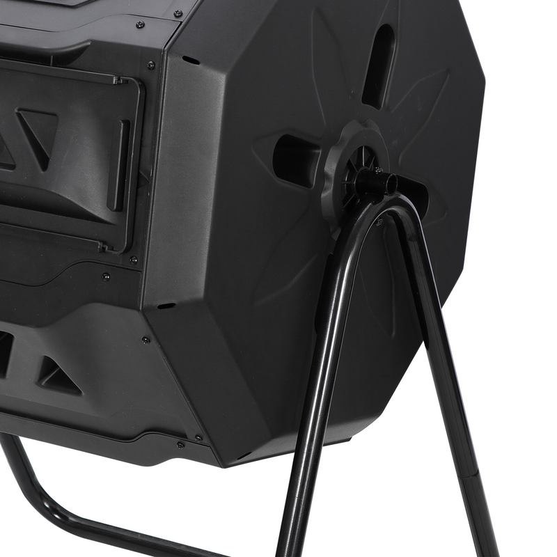 Made from PP material and the frame are constructed of powder-coated steel that makes a solid base. The sturdy steel frame will help prevent rust and corrosion, while the tumbler will keep a regular and even rotation. The compost tumbler design is also very effective, the barrel turns easily without having to dig, turn, and mix the compost by hand. With 2 separate sliding doors covering 2 compartments that can be slide back and forth for easy access. Equally divided into 2 chambers, the first chamber can be filled up and left to decay while you can put new waste into the second chamber. The air holes make sure that the composter has the perfect air circulation. Volume Capacity: A total capacity of 43 gal, it can hold pretty much compost. Black color help build heat inside. Assembly is required, and all hardware and easy-to-follow instructions are included. To increase environmental awareness, foster a sense of community, play an important role to make your home and gardens better. Material: BPA free PP + Alloy Steel Color: Black Net Weight: 22LBs Item Dimensions: 28.5?? x 25?? x 37?? L x W x H Capacity: 43 Gallon