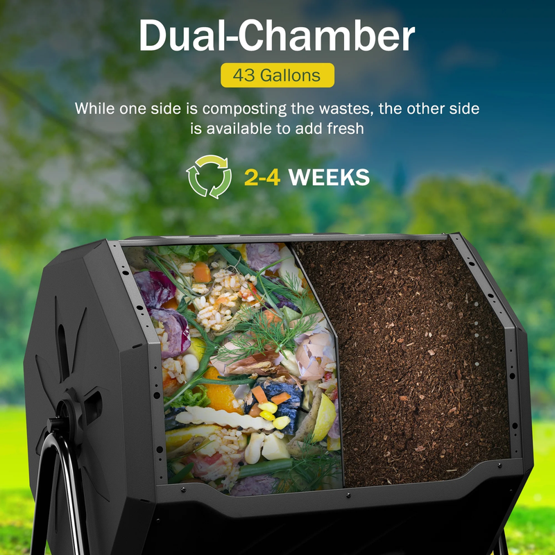 43Gal Outdoor Compost Tumbler Bin - Dual Chambers, Sliding Doors, Black,