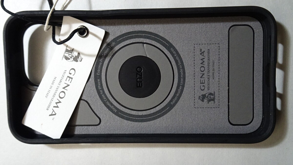 ENZO by Genoma premium iPhone case made with Italian vegetable tanned leather. This case features a built in MagSafe compatible magnetic ring designed for secure attachment and reliable wireless charging.
