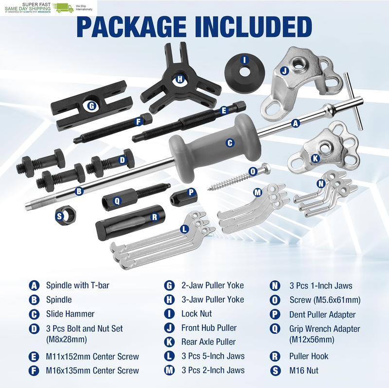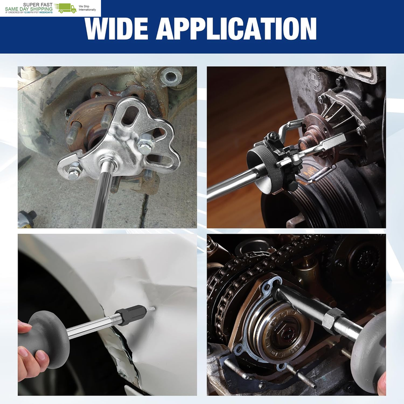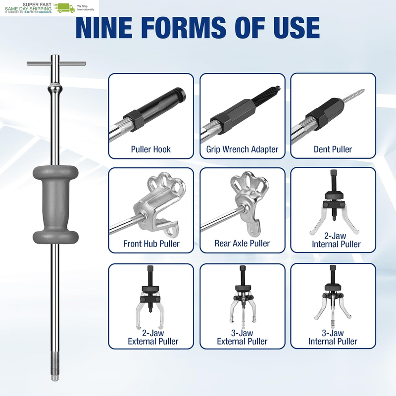 Versatile Design: This 27-piece set unlocks 9 uses for the slide hammer puller. It can remove flanged rear axles, front-wheel drive wheels, and repair dents?all for home, auto, and emergency repairs?with one tool to meet all your needs