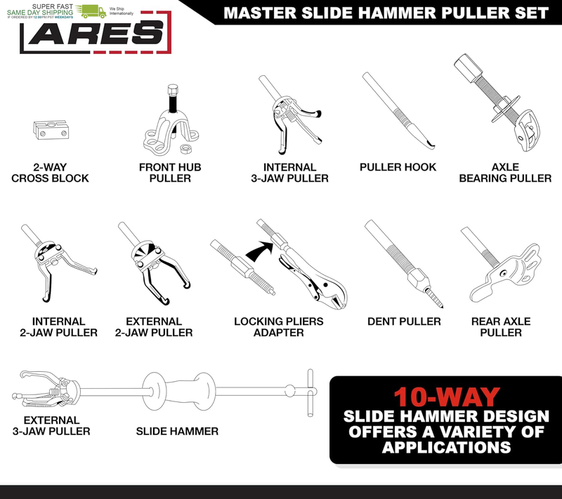RELIABLE | EFFECTIVE | EFFICIENT: Users trust ARES to be quality tools that make an impact. You are backed by our Performance Assurance Limited Lifetime Warranty. If you have any issues with your ARES Master Slide Hammer Puller Set, simply contact customer service for troubleshooting help, parts, replacement, or refund.