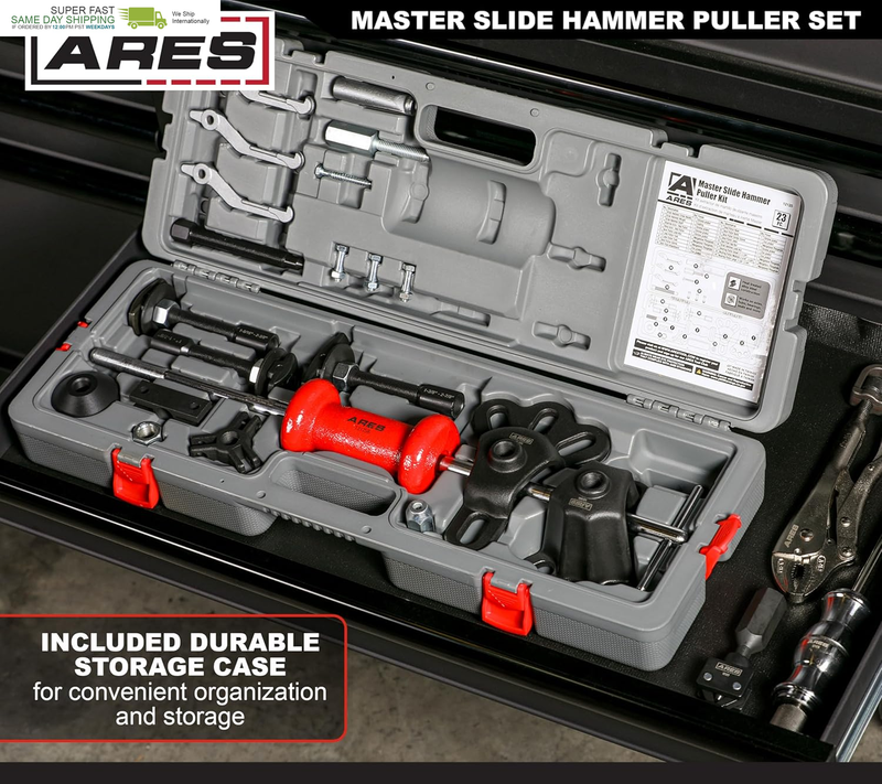 The ARES Master Slide Hammer Puller Set includes a comprehensive set of tools for seal pulling, bearing removal, and more, as well as a durable storage case.