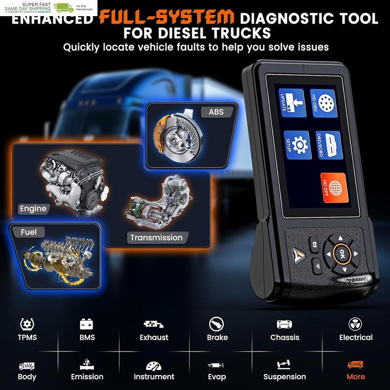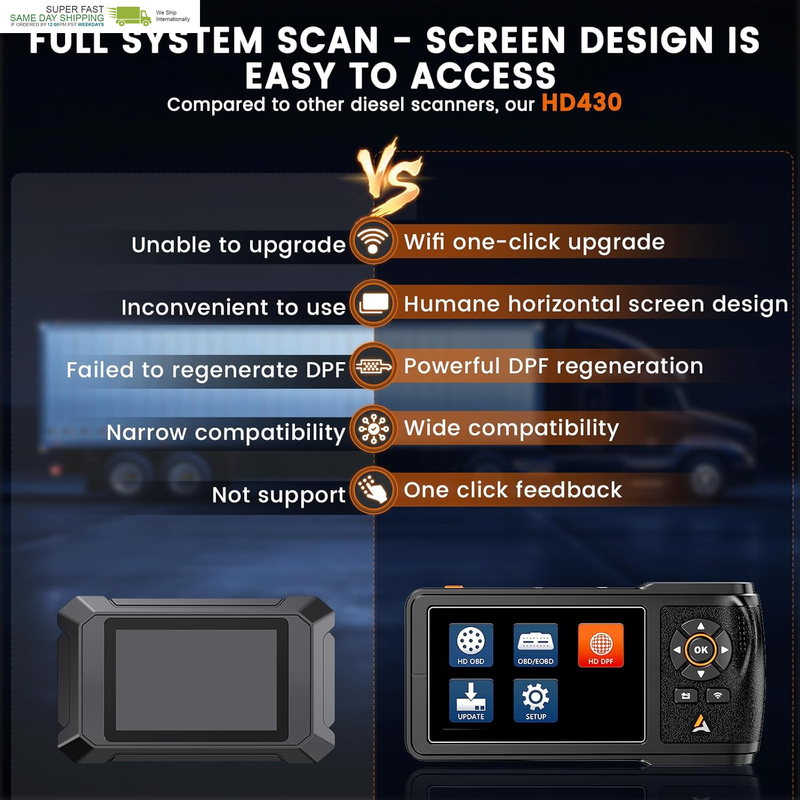 ?Diesel Full System Diagnostic Tool?HD430 has excellent diagnostic performance, quickly scanning truck systems, detecting truck faults, while supporting the engine, ABS, transmission, fuel system and more. Read the fault code and DTC Lookup help you understand the cause of the fault, quickly clear the fault code after maintenance, so provide you with good maintenance assistance and convenience. HD430 heavy duty truck scanner will provide efficient, fast scanning of your truck system.