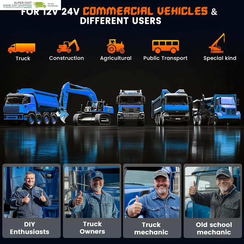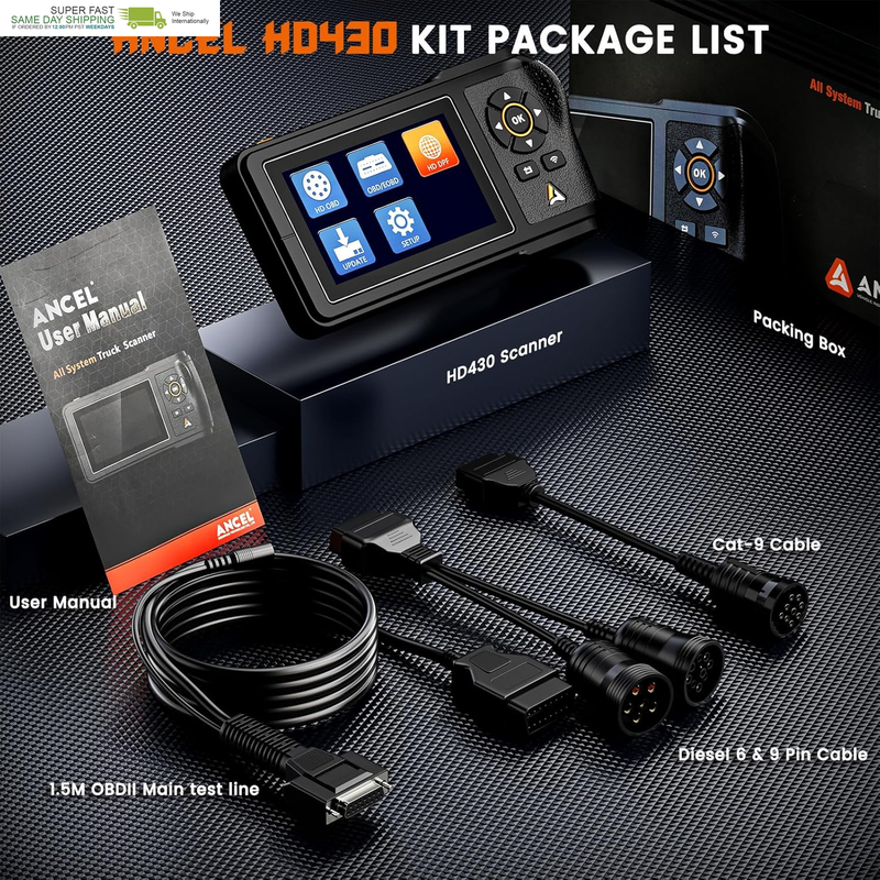 ?Wide Compatibility?HD430 supports 12V 24V trucks, equipped with diesel connectors (CAT-9, Diesel 6pin 9pin) and OBDII 16pin, with strong truck adaptation and compatibility. Product supports SAE J1939, SAE J1708, SAE J1850 PWM, SAE J1850 VPW, ISO 14230-4, ISO 9141-2, ISO 15765-4, ISO 27145-4 truck protocols, provides complete scan fast scan, and available in English and Spanish, it is suitable for DIY enthusiasts, old-school mechanics, truck owners or small repair shops.