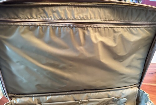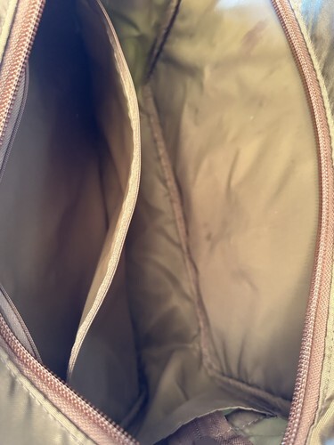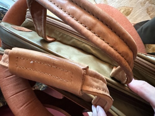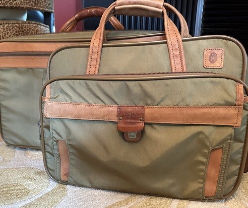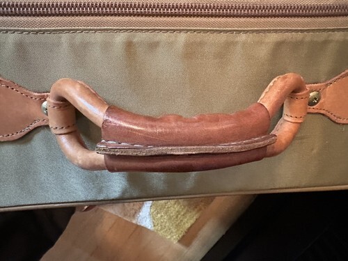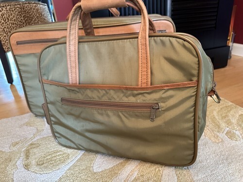 Discover a rare find-a 6-compartment carry-on luggage bag in a unique light olive-green nylon with genuine tan leather accents and trim.