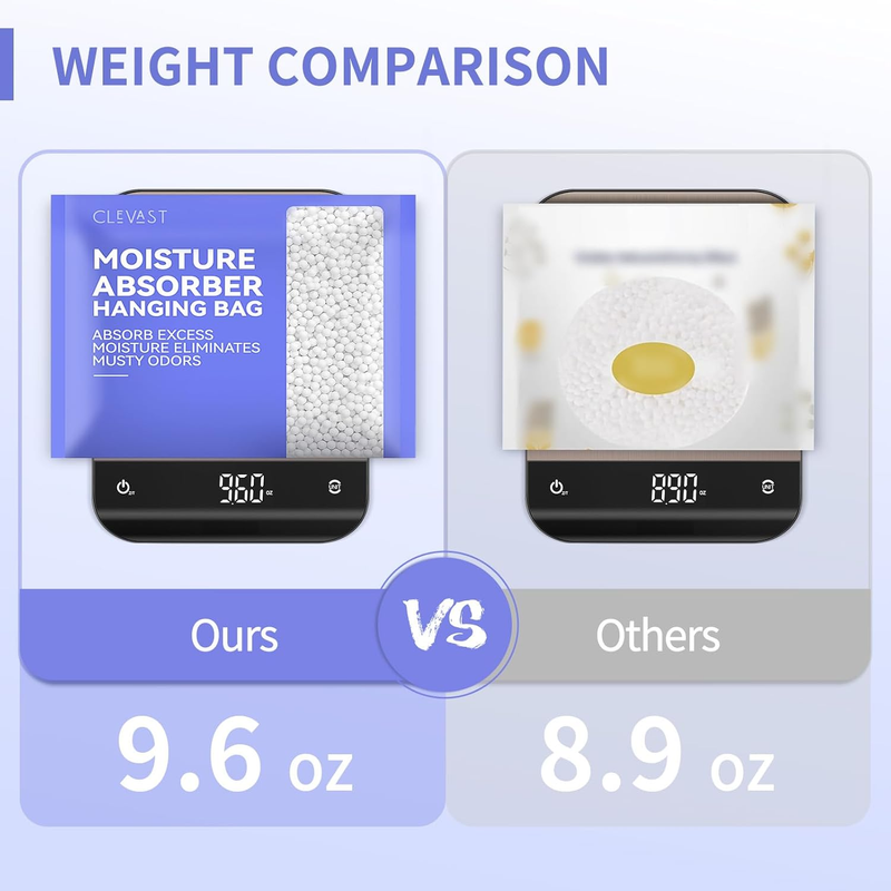 The CLEVAST dehumidifier bags feature spherical calcium chloride particles that can attract and absorb excess moisture quickly and efficiently. Moisture absorbers are designed with a premium one-way moisture-permeable paper that will securely lock the moisture inside.