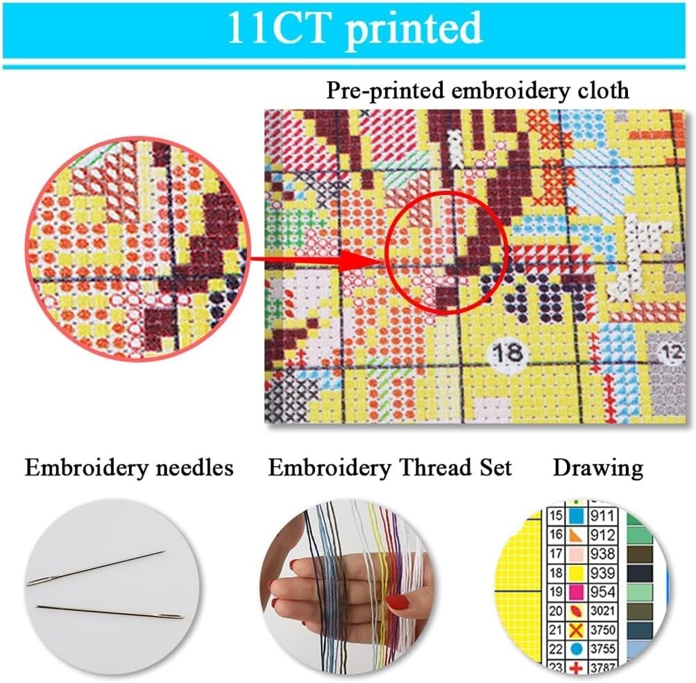 Includes all essential tools: pre-printed fabric, color-coded threads, needles, and illustrated instructions.