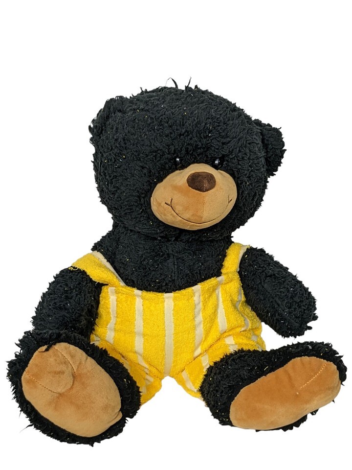 Black Teddy Bear Yellow Striped Overalls Plush Stuffed Animal 15.5"