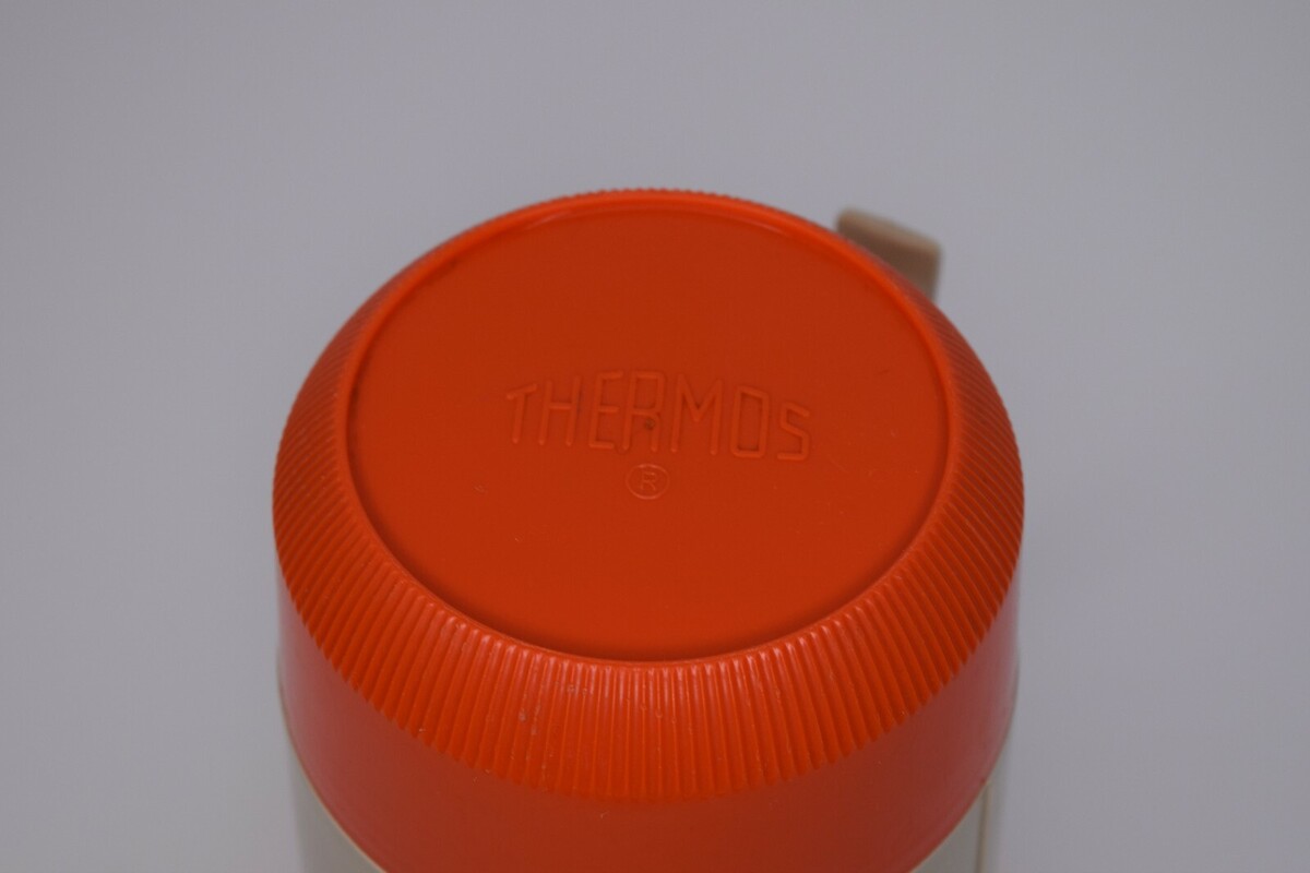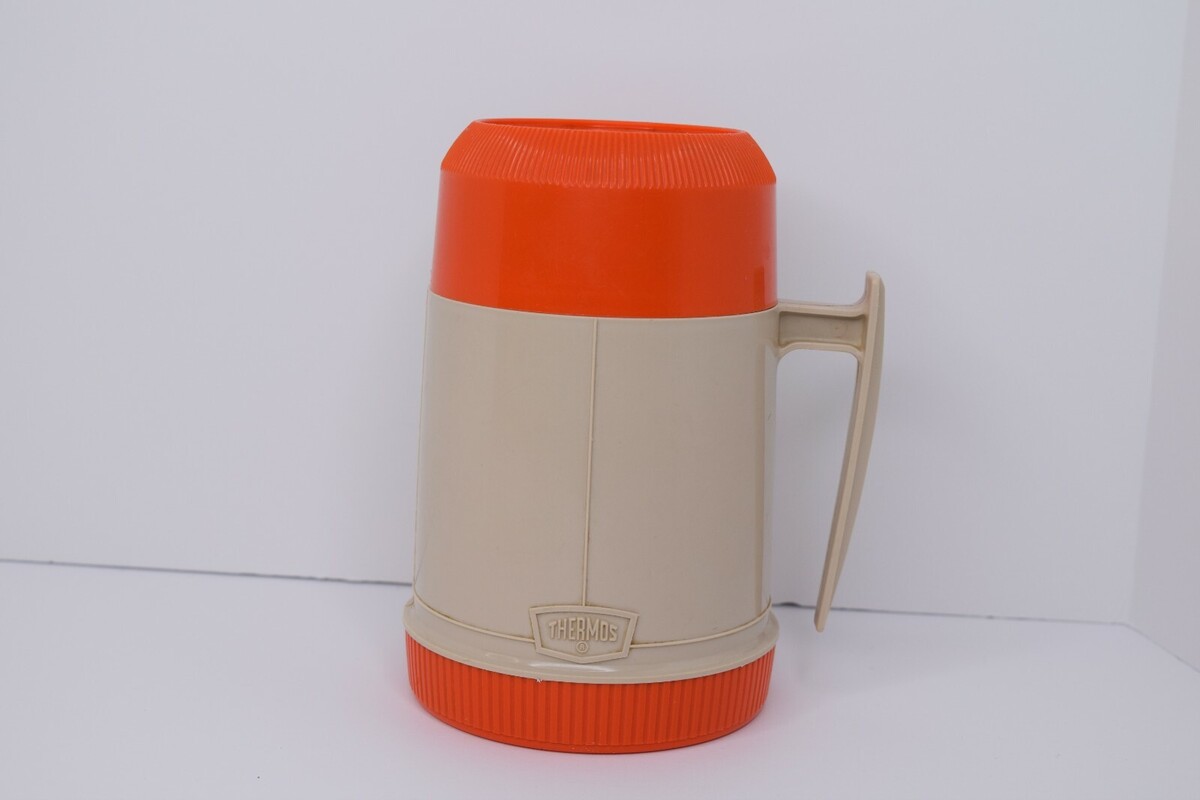 Vitage Thermos Brand Orange Tan Model #6002 10 oz. Wide Mouth Plastic. Pre-owned in Good Condition. Some light wear from use but overall nice. See all photos for details and condition. Will ship USPS Priority Mail.