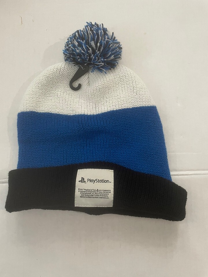 Playstation Mens Beanie Pom Winter Hat Cuff NWT Black White Blue.