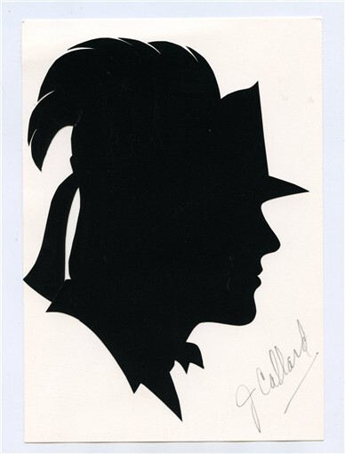 Male Silhouette in Plumed Hat on 7" x 5" Backer Board Has name J Callard written in pencil on front and Hampton Mansions 1981 on the back.
