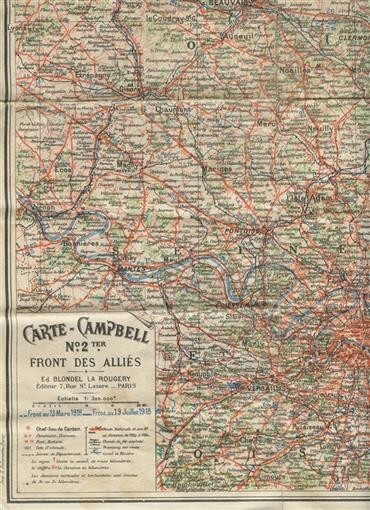 Opens to about 26 1/2" x 19" and is printed on only one side. In French. Carte Campbell No 2 Ter Front Des Allies World War One Map March to July 1918. Ed. Blondel La Rougery of Paris. Shows Roads, Railways, and the Front on 13 March 1918 and the Front on 19 July 1918