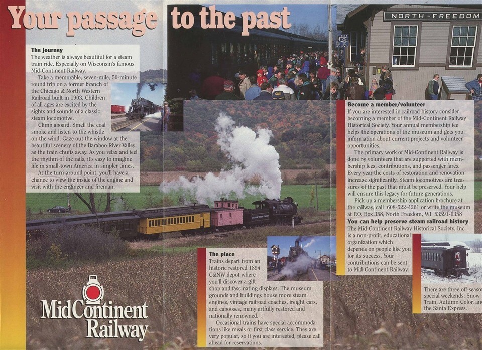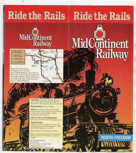 A colorful 6 panel fold out brochure with photos, map , detailed history and information, Dated 1996. MidContinent Railway Brochure. Located North Freedom Wisconsin