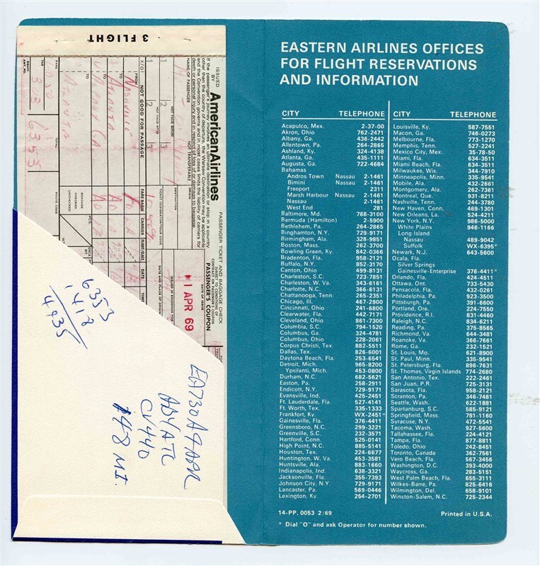Eastern Airlines 1969 Ticket Jacket American Airlines Ticket