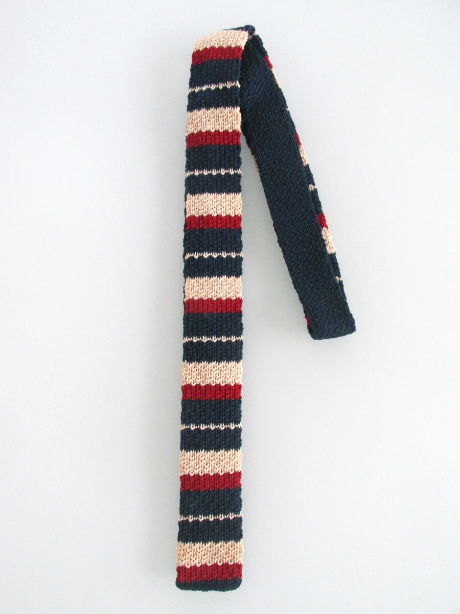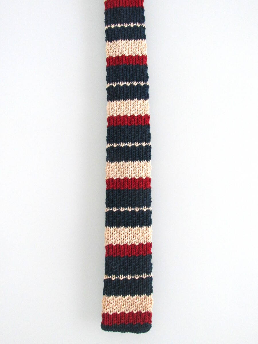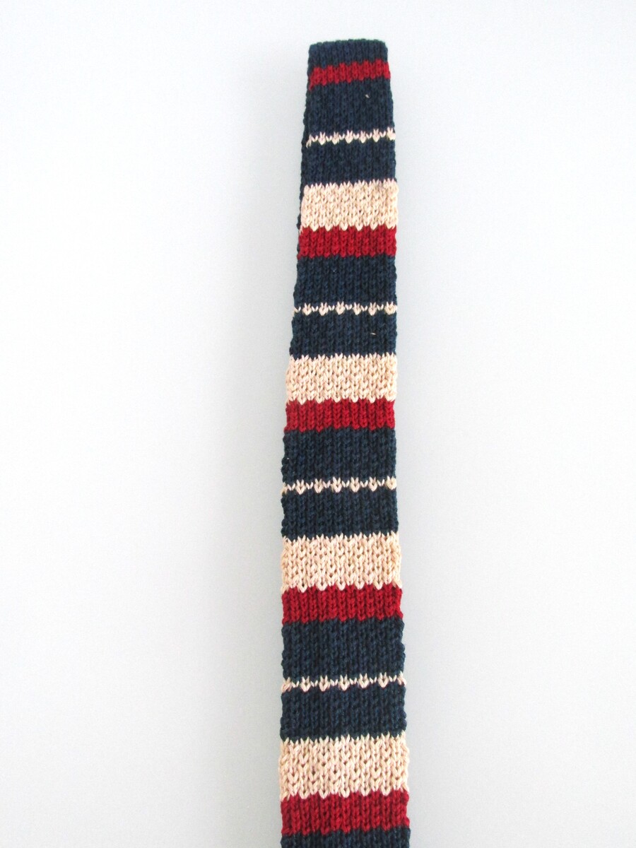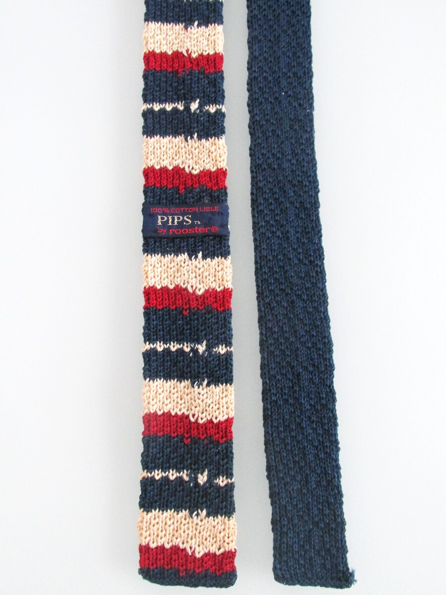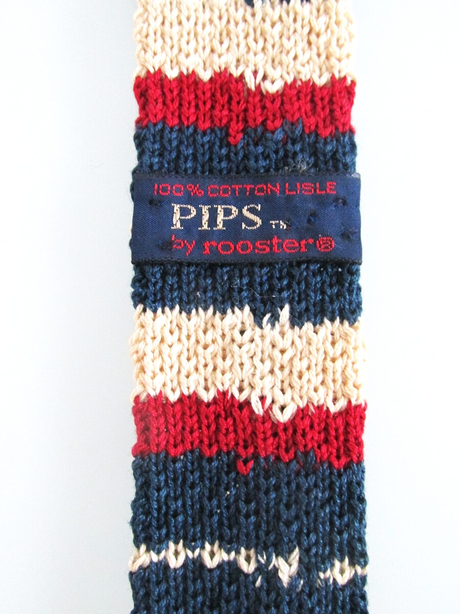 Description: Up for sale is a Rooster brand "Pips" vintage flat square bottom men's cotton knit tie. This tie is made in the USA of 100% cotton. It has a striped design in red, blue, white. Dimensions are 52" long x 1 5/8" wide. This tie is in excellent condition.