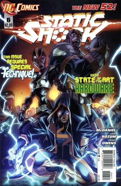 *Static and Hardware attempt to save Sharon Hawkins from the dangerous criminal mastermind who is responsible for the Hawkins family tragedy. They find Sharon at the heart of a war raging between this sinister mastermind, the brutal Piranha and the unpredictable Pale Man, all battling for the secret of the Darkstar Defense Force. Static is absolutely determined to save his sister and set things right, even if it costs him his own life.""(W) Scott McDaniel, John Rozum (A) Scott McDaniel, Andy Owens (CA) Khary Randolph.