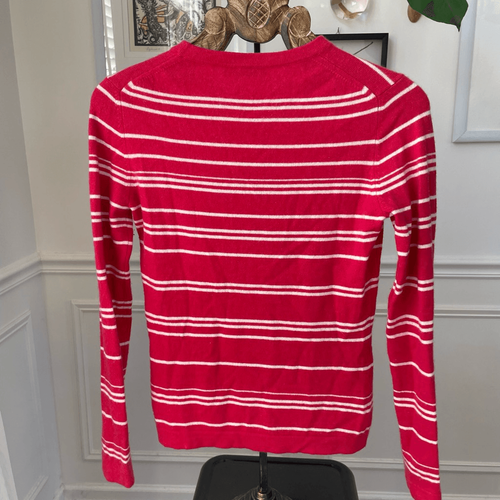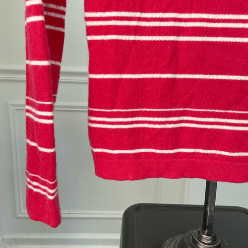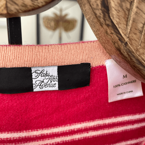 Women?s Saks, Fifth Avenue, 100% cashmere crewneck sweater in bold tulip pink with variegated white stripe. At a glance in photos this sweater looks red but it is more of a tulip pink color than a primary red color. Laying flat measures 23 inches shoulder to hem and 18 inches armpit to armpit. Tag size medium, however, in my opinion, this fits closer to a small, so I?m listing it as a small, but please double check measurements to ensure the proper fit for you.
