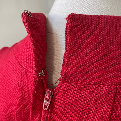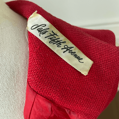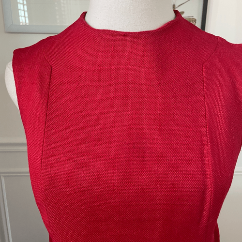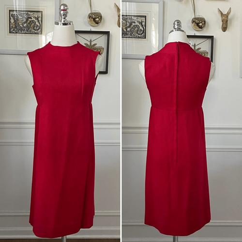 Vintage 60s Saks Smith Avenue women?s mock neck sheath dress in a textured nubby weave red. Back zip closure with back neck hooks, and one on seam welt pocket in the front. Sleeveless. Two tone blue and white I LGWU union tag. Laying flat measures 35 inches shoulder to him, 16 inches armpit to armpit with darting to accommodate cup size and 15 inches straight across the waist. Based on these measurements, I estimate it to be approximately a modern small or medium. It is featured on my size small dress form for scale. Please double check measurements to ensure the proper fit for you.