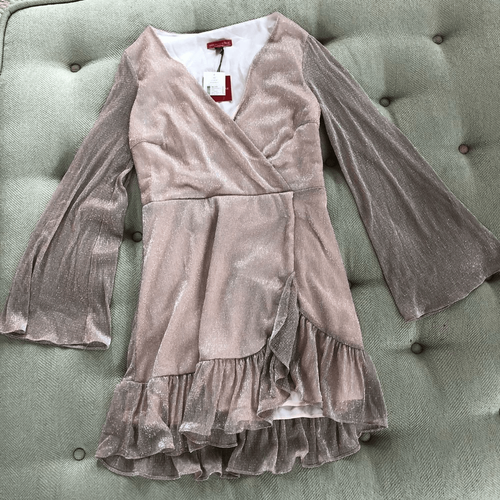 New with tags Saks fifth Avenue wrap look dress in blush with silver shimmer. Side zip and single front snap closure. Ruffle along the Tulip how mine skirt. Lined through the body with sheer trumpets sleeves. Approximately 33 inches from shoulder to hem, 14.5 inches straight across the waist and 19 inches from armpit to armpit.