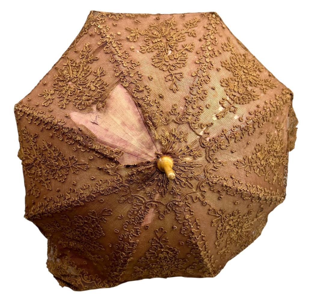 Antique Victorian Ladies Lace Umbrella Parasol Carved Handle Gorgeous antique item that is very fragile and tore when we opened it so we are selling it AS-IS For Parts or Repairs Comes as shown