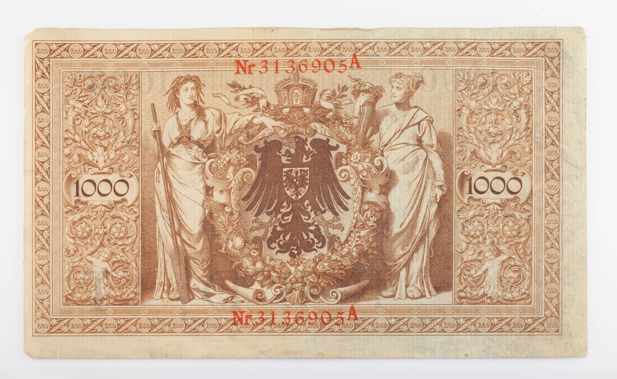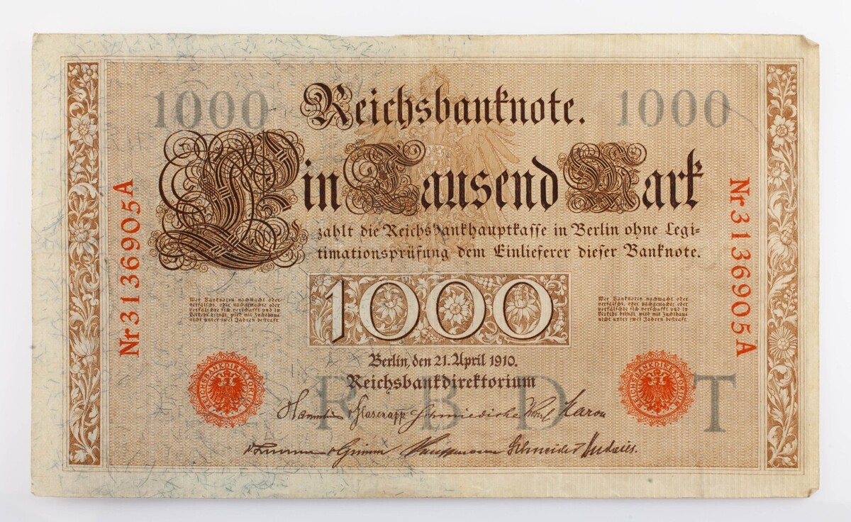 Lotto di 3 1910 - 1918 1000 tedeschi Note del marco tedesco Sigillo rosso F-VF KM #44a, 44b
