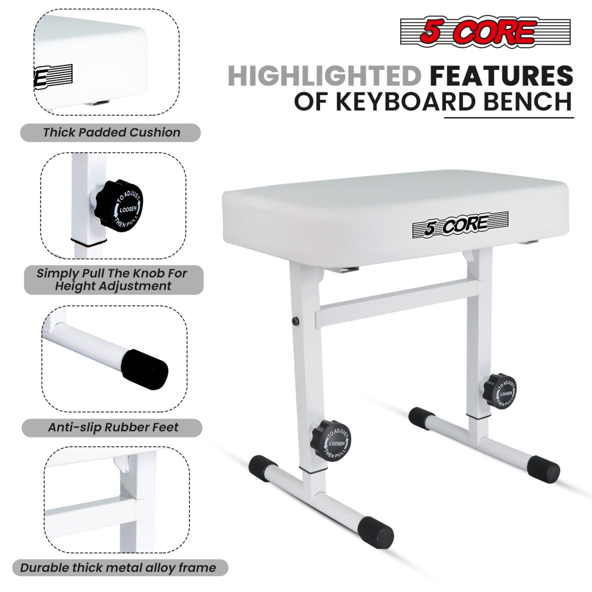 5 Core professional keyboard bench offers exceptional support with a 260 lb weight capacity, perfect for adults and kids. The padded 3 inch thick breathable sponge seat ensures comfort during long playing sessions, while the adjustable height (17 inches to 22 inches) and 5 position gear system allow for easy customization.